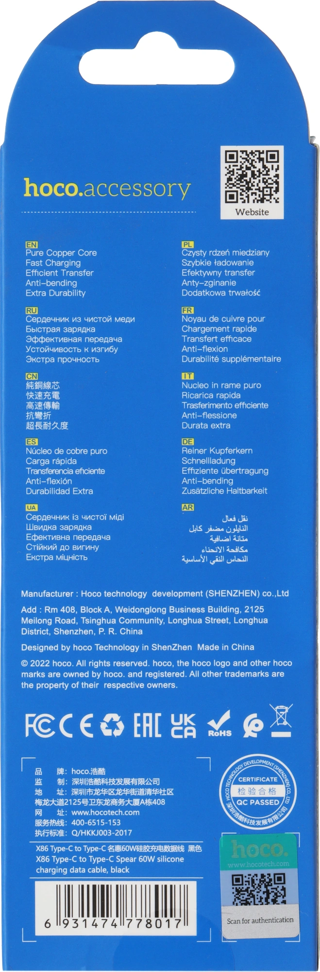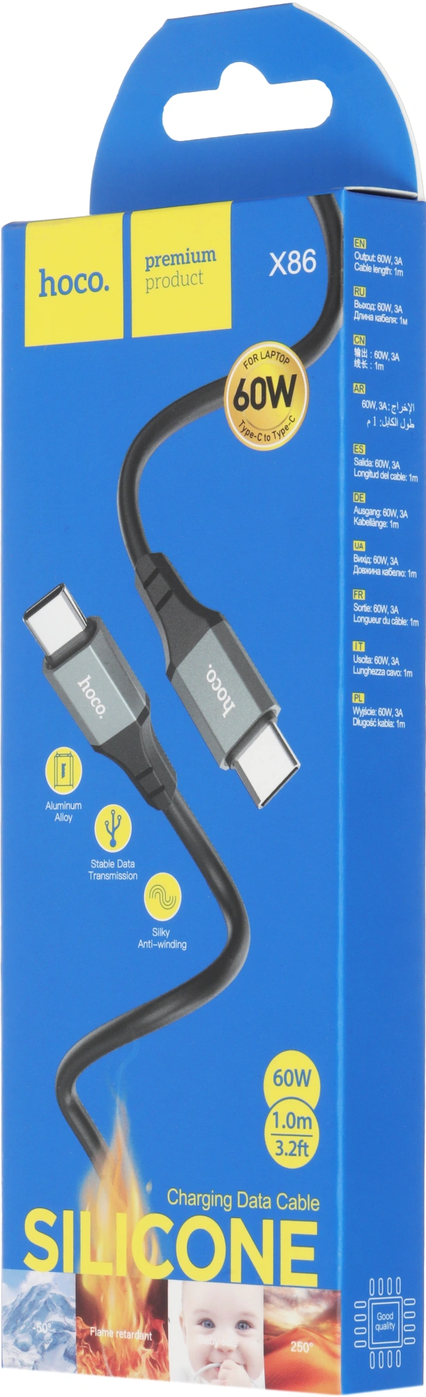 X86 Spear, кабель для зарядки и передачи данных Type-C на Type-C, 1м, силикон и алюминиевый сплав, поддержка 60W (20V/3A) для ноутбуков и 3A для телефонов.