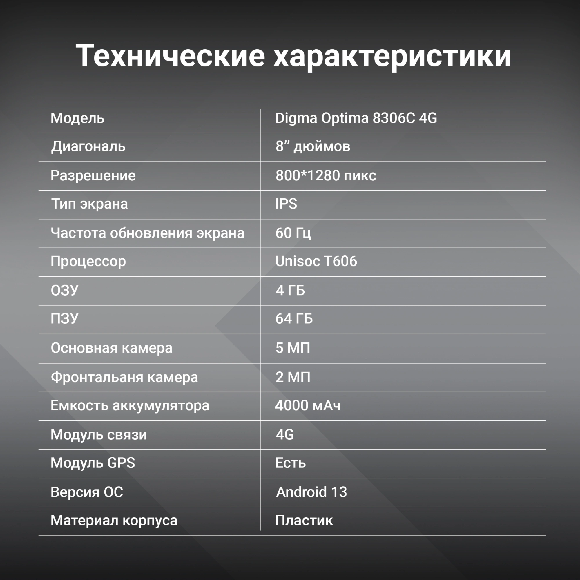Digma Optima 8306C – комфортный и недорогой планшет для решения повседневных задач: серфинг в интернете, общение в мессенджерах и социальных сетях, просмотр контента, чтение книг и нетребовательные игры. Планшетный компьютер работает на Android 13.