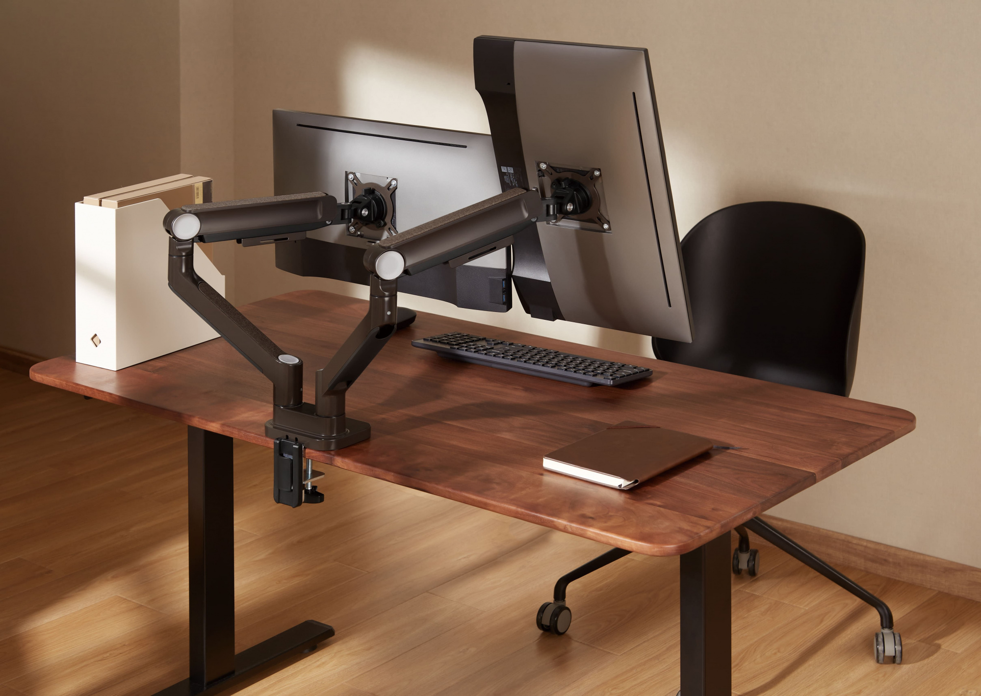 Встроенный пружинный механизм натяжения поможет для идеальной регулировки веса. Съемная пластина VESA позволяет легко устанавливать и снимать монитор.