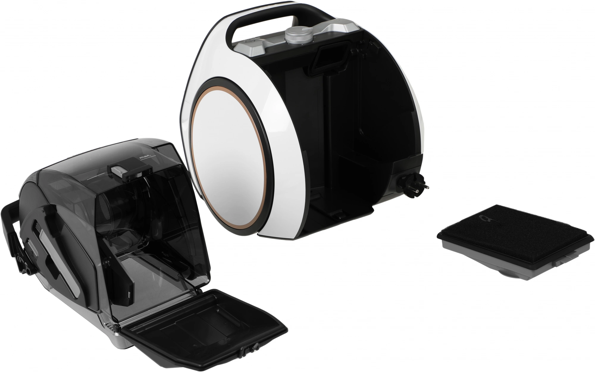 легко очищаемый пылесборник, поворачивающиеся колеса, шланг
