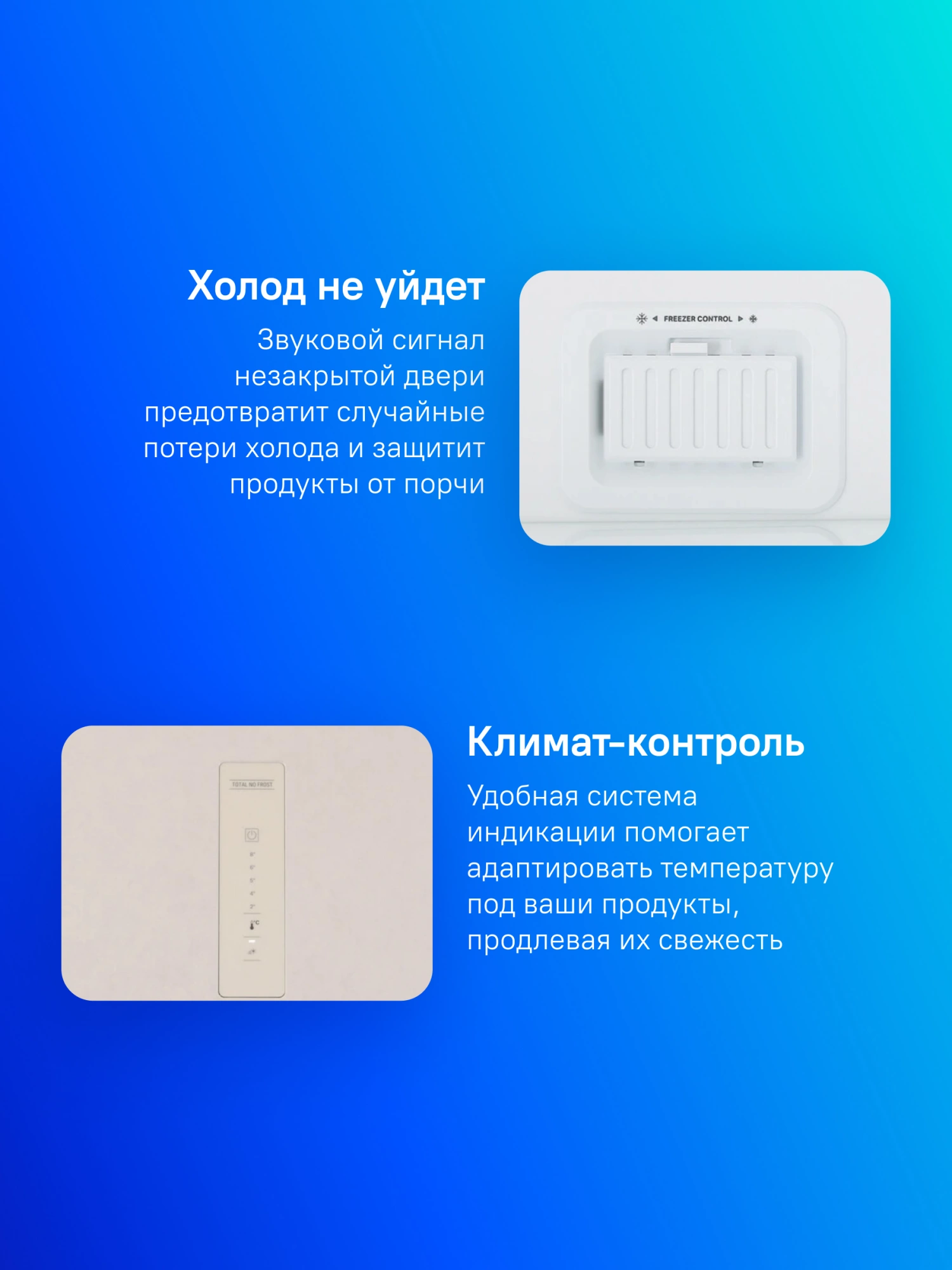 визуальная индикация отключения электропитания, звуковой сигнал незакрытой двери, температуры