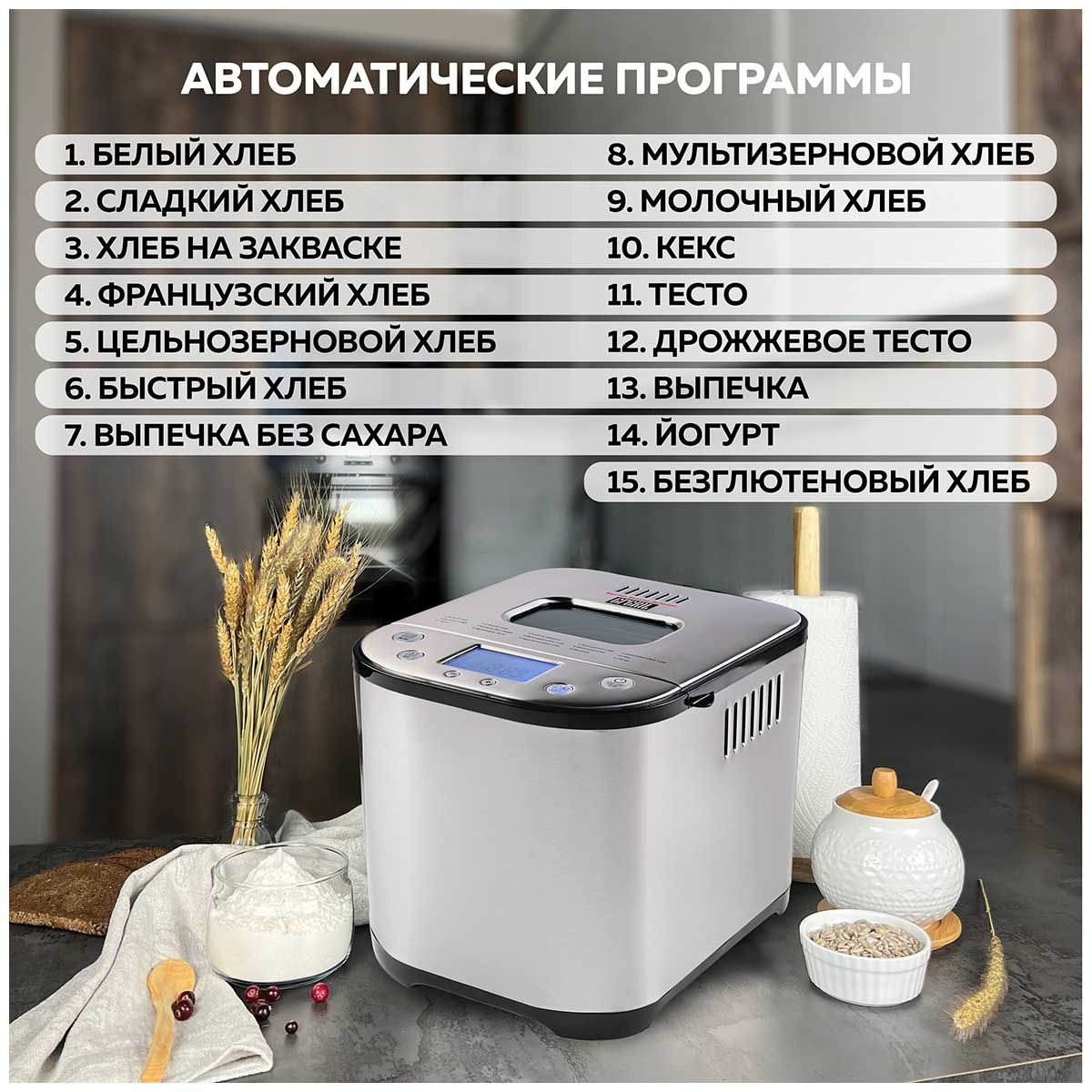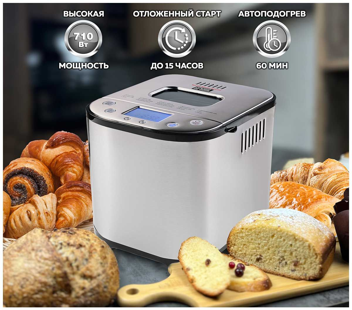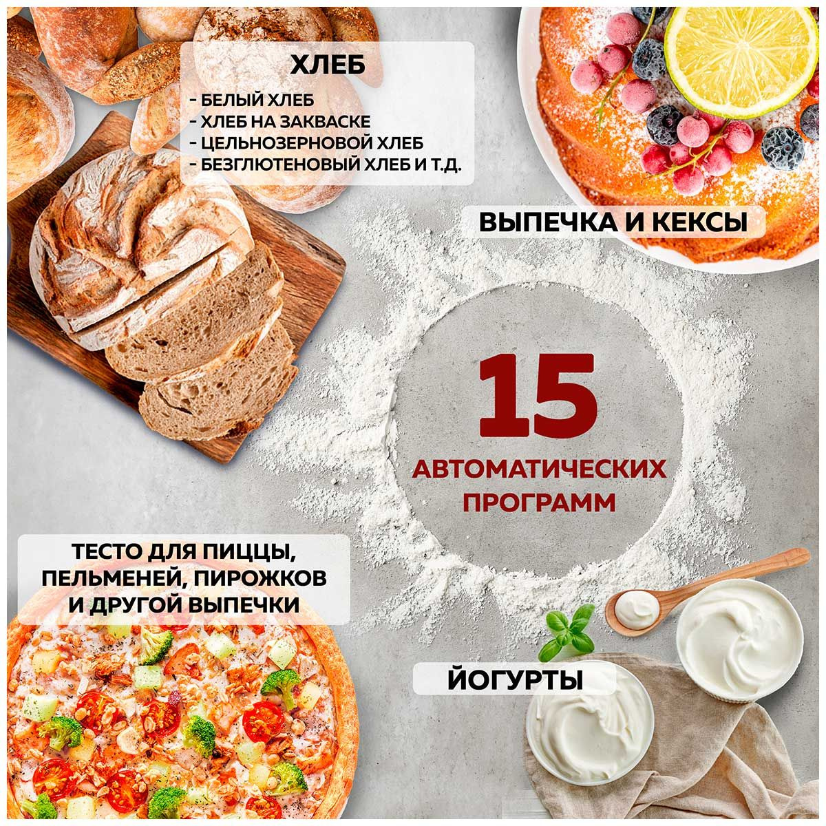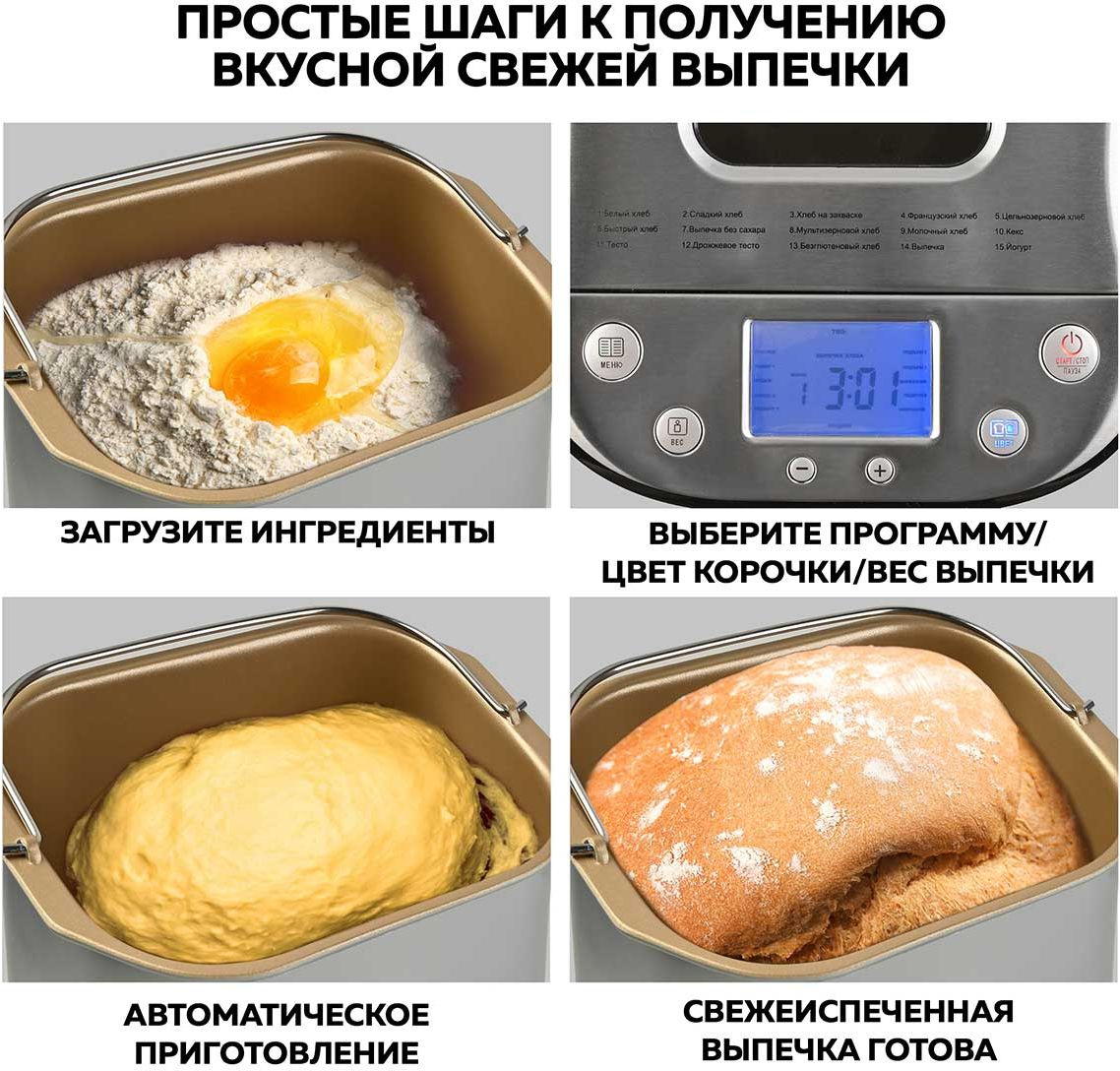выбор цвета корочки, запоминание программы, звуковой сигнал для добавления ингредиентов, пауза, поддержание температуры, регулировка веса выпечки, режим ускоренной выпечки, таймер отсрочки старта