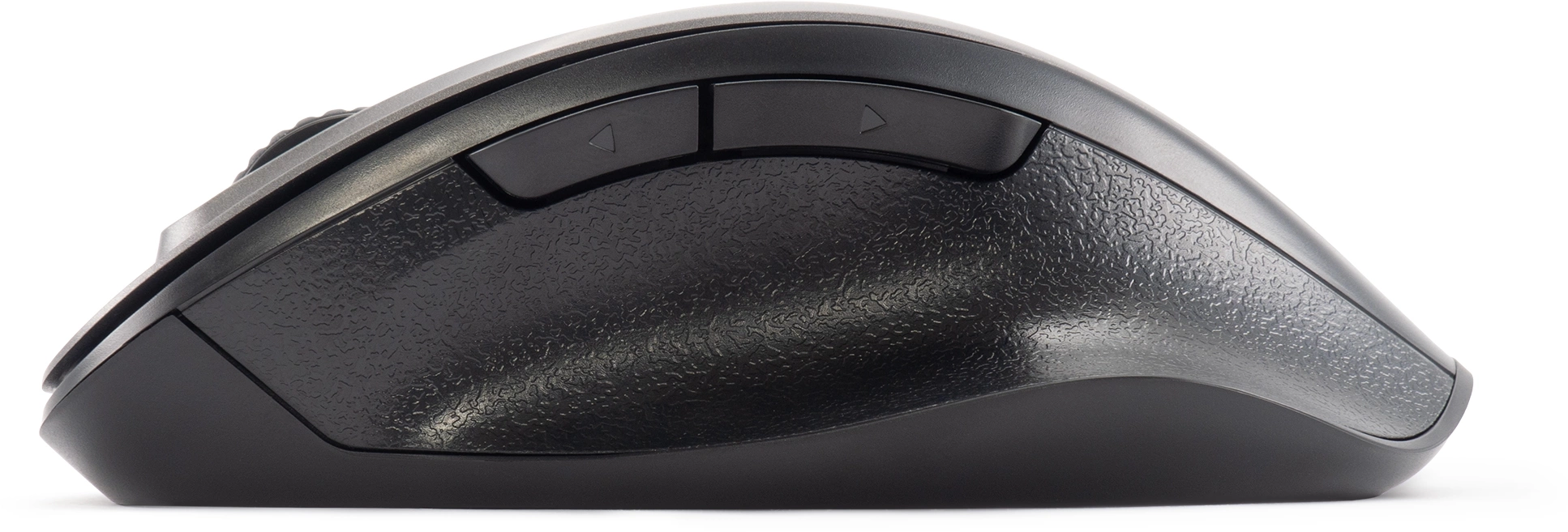 Корпус модели будет удобен для использования правой рукой. Верхнее покрытие предотвращает скольжение руки и обеспечивает надежный контроль над устройством. Мышь выполнена в черном и сером цветах. Колесо прокрутки прорезиненное.