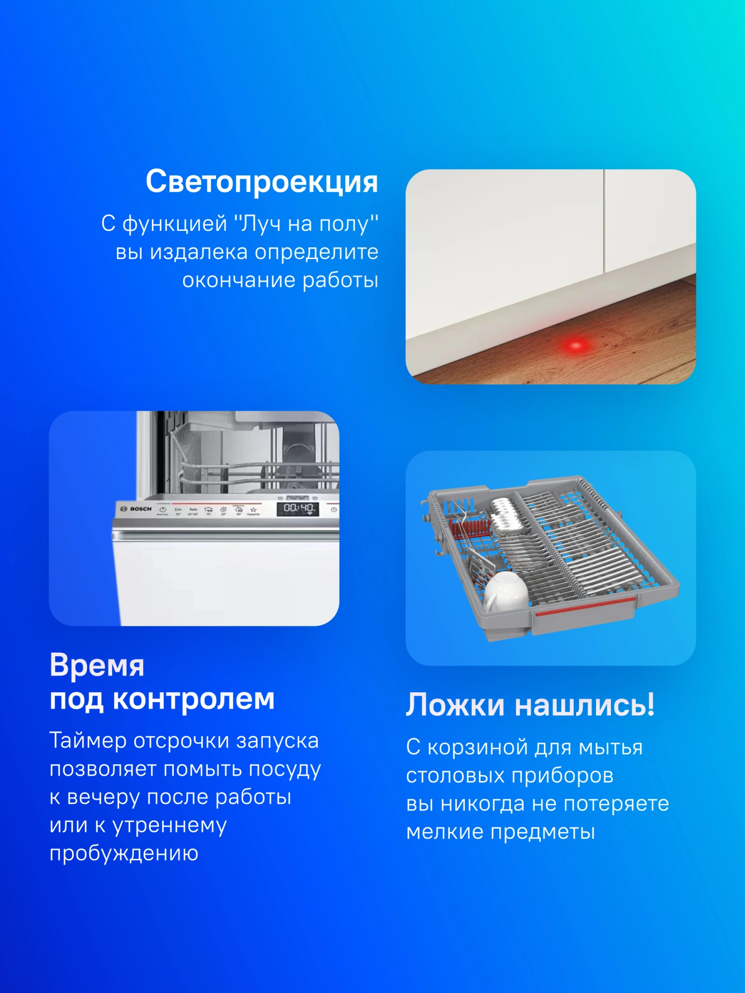 времени до конца программы, звуковой сигнал, луч на полу, наличия ополаскивателя, наличия соли