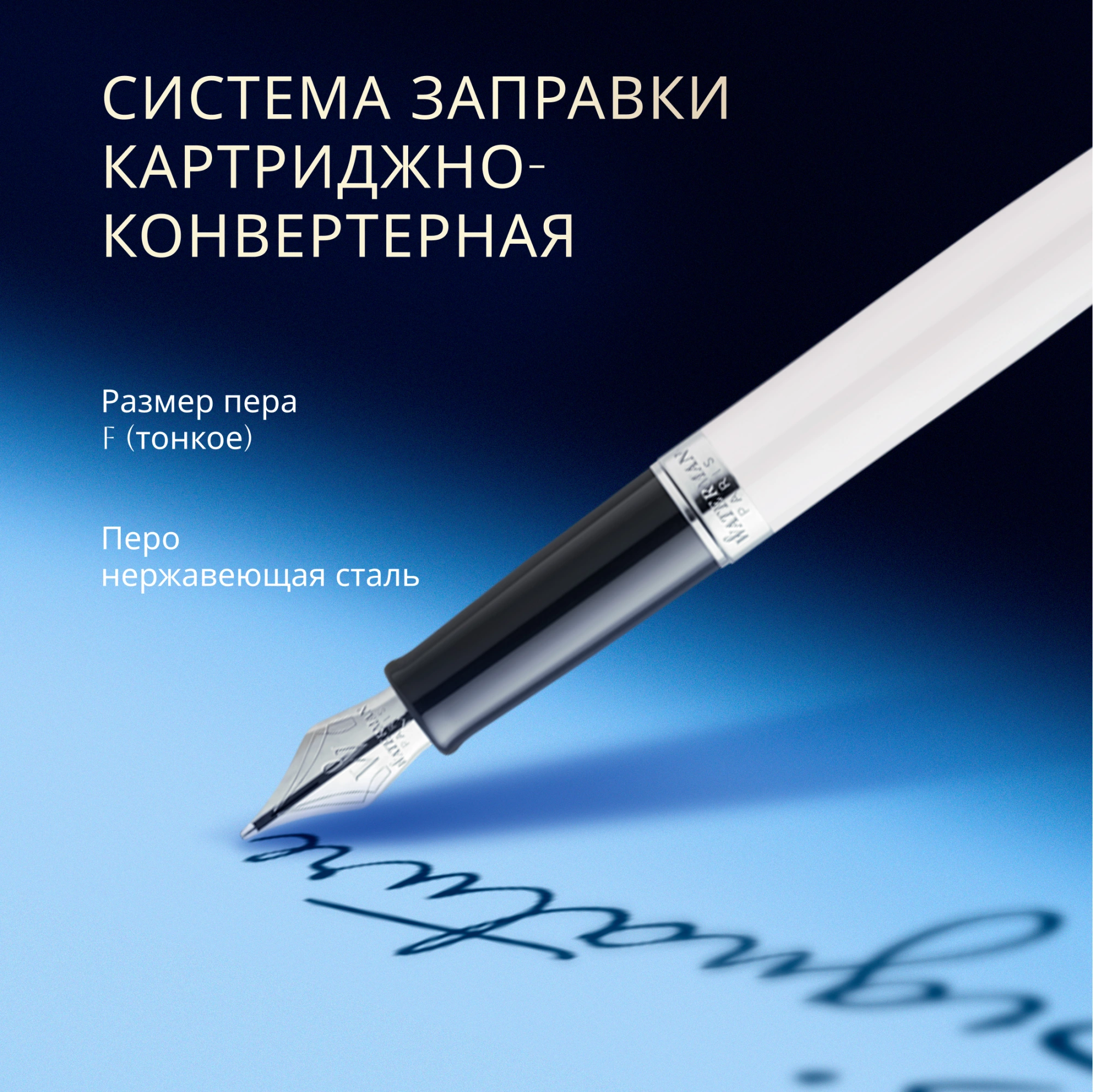 Сделайте яркое заявление о себе с коллекцией ручек Hemisphere Color Blocking. Модная перьевая ручка, вдохновленная самой смелой тенденцией этого сезона, колор-блокингом, стильно отделана черным лаком на колпачке и белым лаком на корпусе. Её поразительная привлекательность великолепно подчеркивается классикой стиля Waterman, фирменным раздвоенным клипом и потрясающей отделкой с палладиевым покрытием. Гравированное перо из нержавеющей стали с палладиевым покрытием красноречиво демонстрирует культовую петлевую букву Waterman «W».