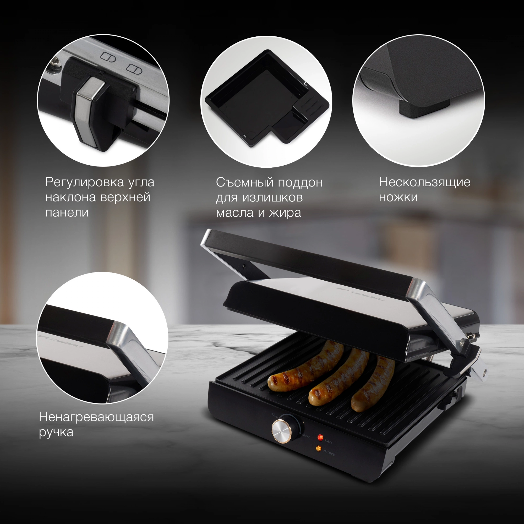 С помощью электрогриля можно приготовить мясо, рыбу, бутерброды, сэндвичи, тосты, овощи и многое другое. Ребристая поверхность и высокая температура панелей способствуют быстрому приготовлению и проявлению характерного «полосатого» рисунка на продуктах.