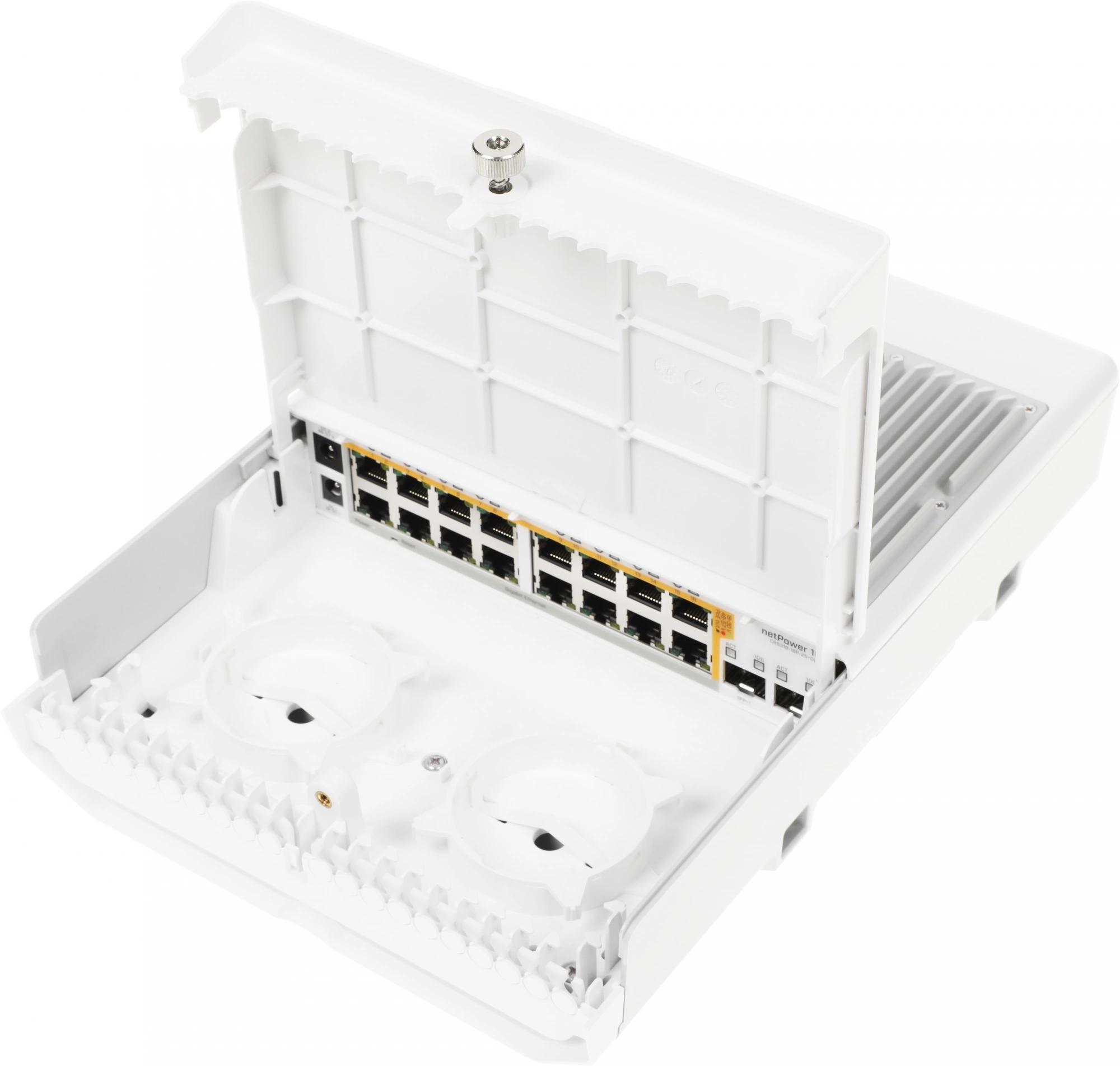 Всепогодный 18-портовый коммутатор с функцией раздачи PoE-питания на 16 гигабитных портах и двумя портами SFP+ (10 Гбит/с) — сверхпростой способ запитать множество точек доступа или IP-камер, а также оборудование нескольких восходящих каналов, размещённое на телекоммуникационной вышке.