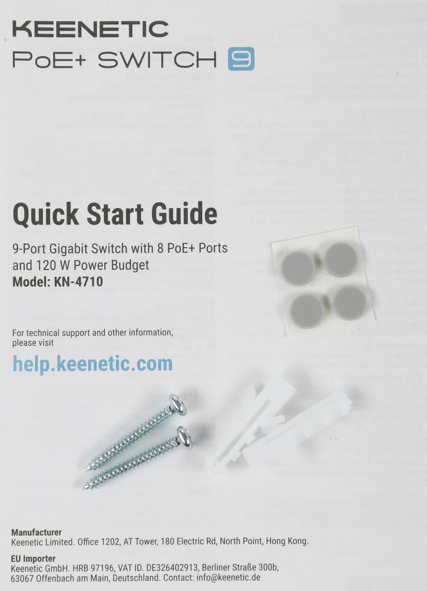 Устройство, Адаптер питания, Самоклеящиеся резиновые ножки, Комплект настенного монтажа, Инструкция