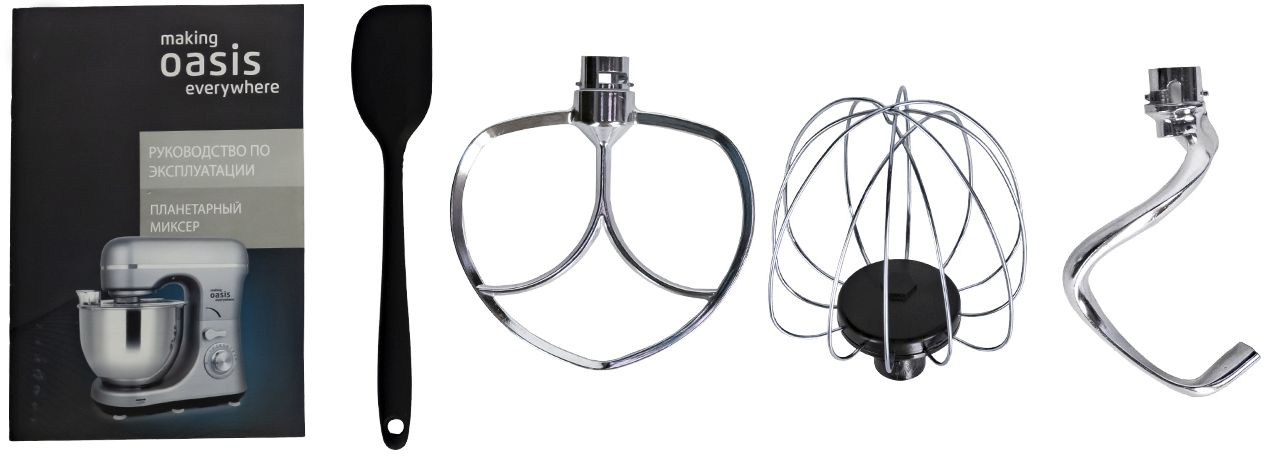 Планетарный миксер – 1 шт. Чаша миксера – 1 шт. Крышка для чаши – 1 шт. Насадка-крюк – 1 шт. Насадка-лопатка – 1 шт. Насадка-венчик – 1 шт. Силиконовая лопатка – 1 шт. Инструкция по эксплуатации с гарантийным талоном – 1 шт