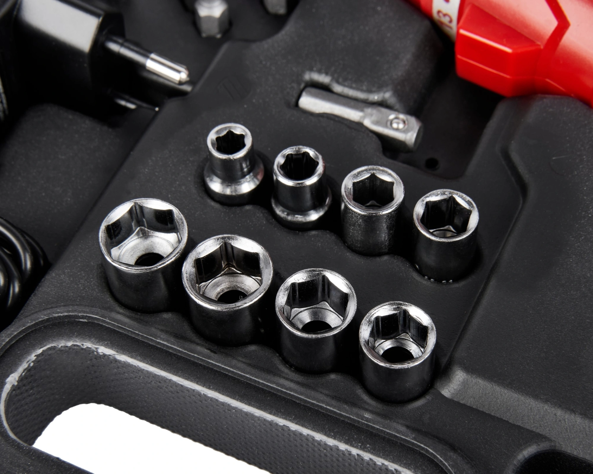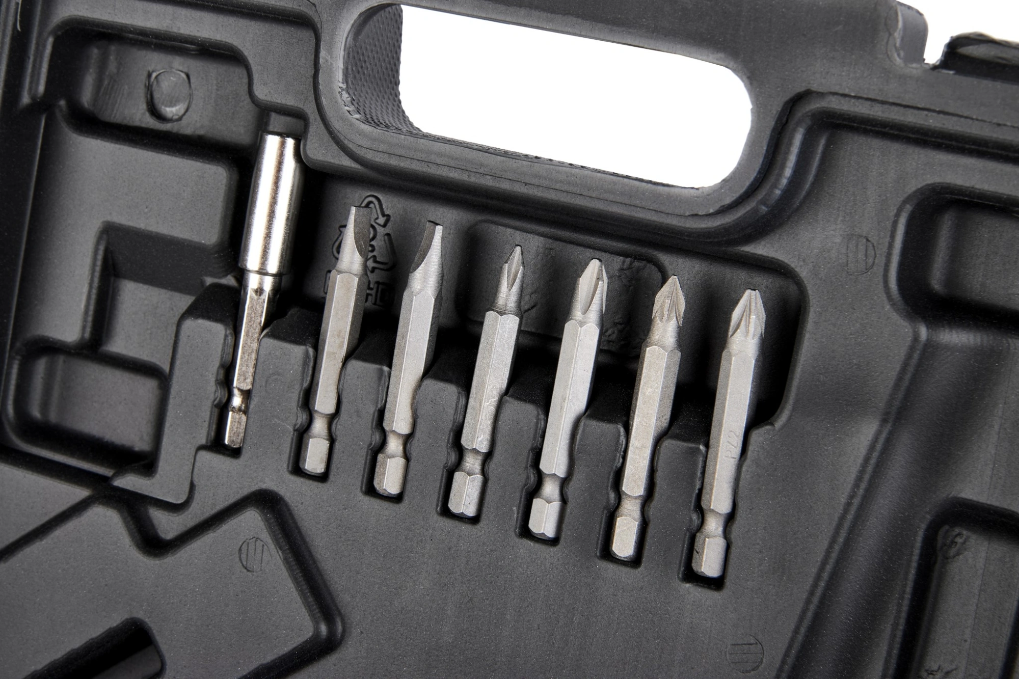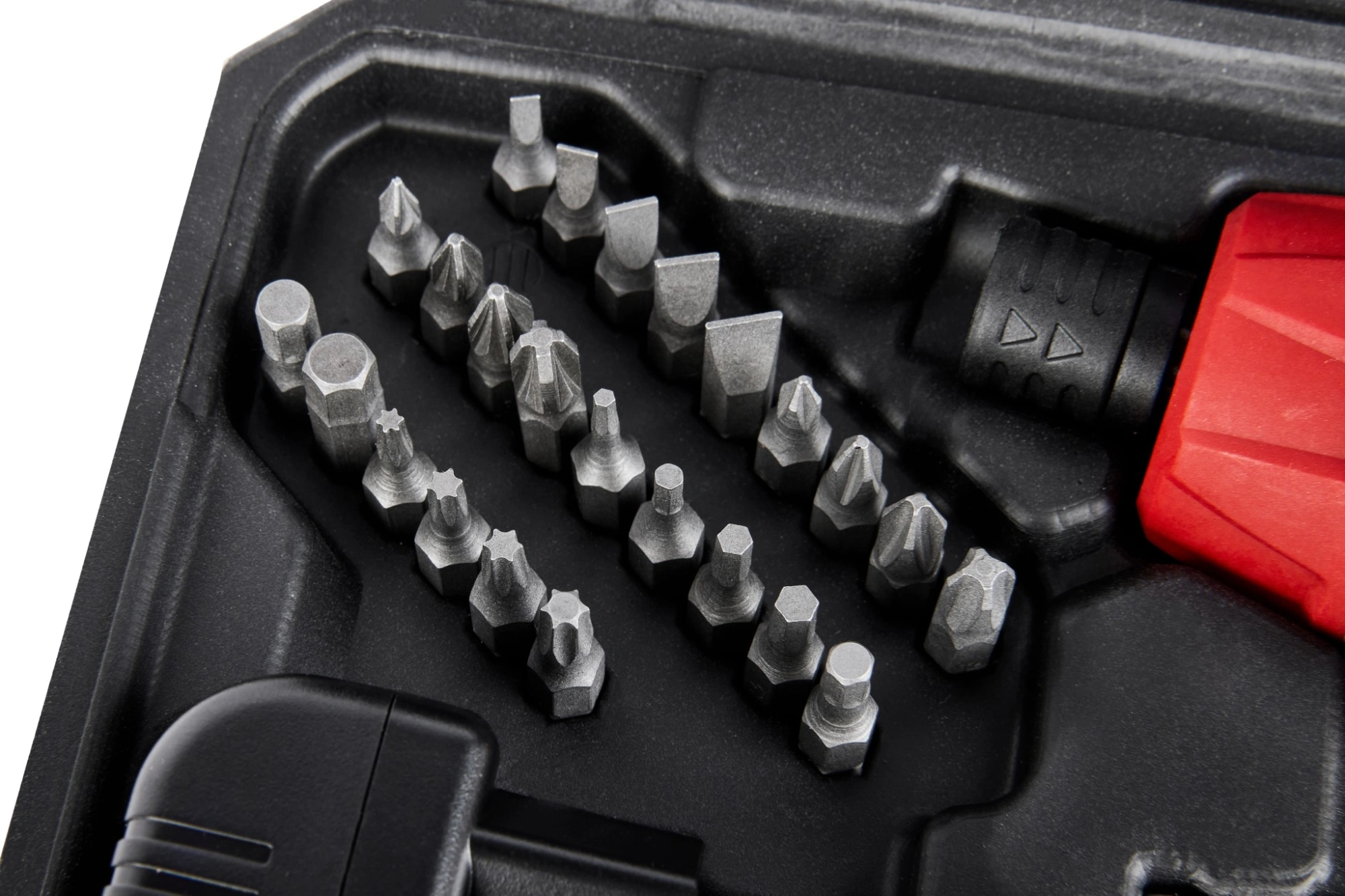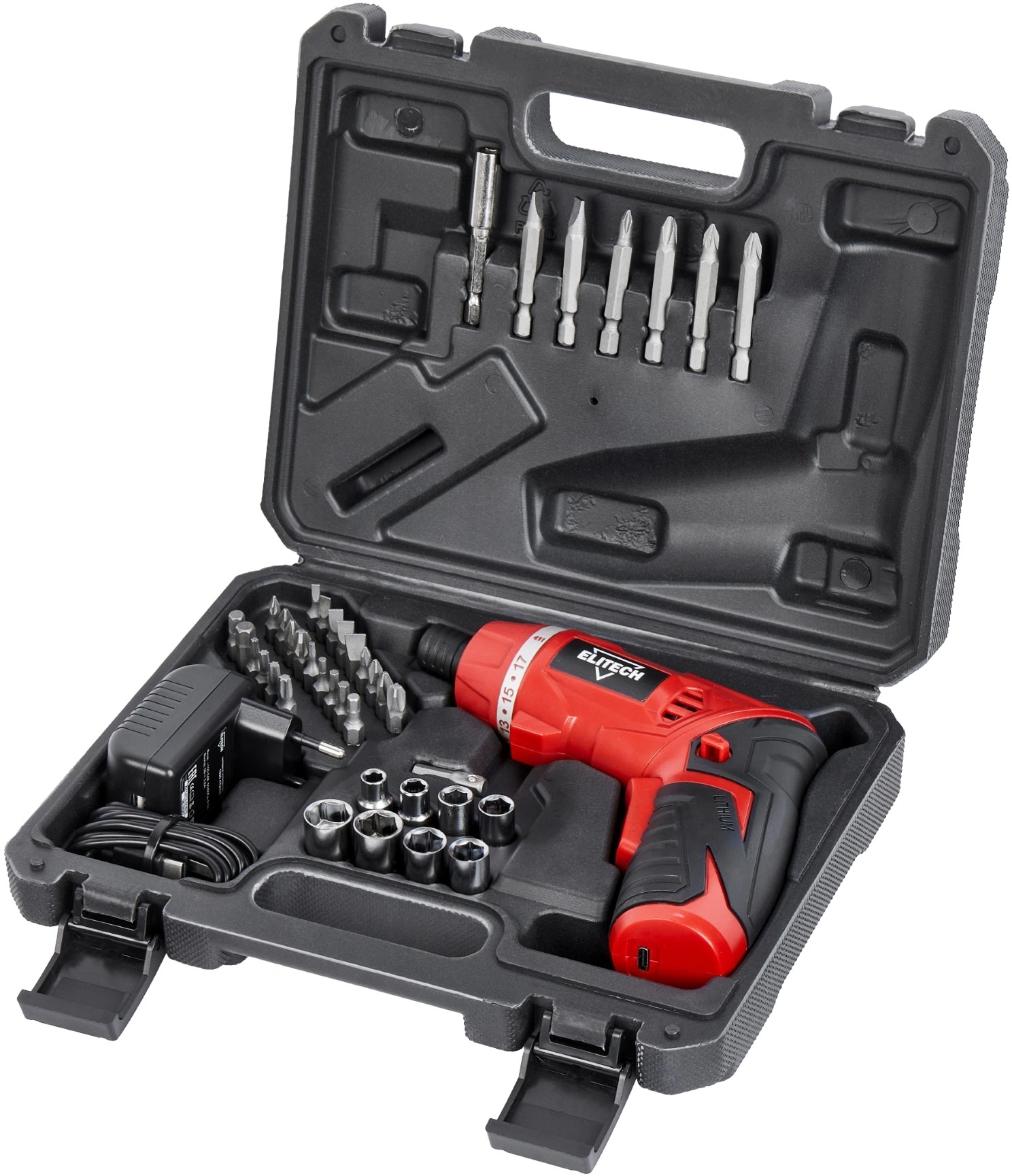 Отвертка, кабель USB-type C, битодержатель магнитный, переходник для головок, головки - 8 шт., бита 50 мм. - 6 шт., бита 25 мм. - 24 шт., паспорт, кейс.