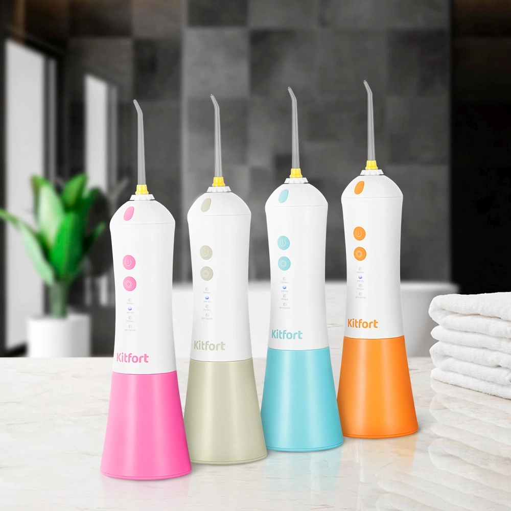 Портативный ирригатор Kitfort КТ-2958 — это простой и эффективный прибор для чистки полости рта. Тонкая и сильная струя воды не только вымывает остатки еды, налёт из межзубного пространства и пародонтальных карманов, но и массажирует дёсны.