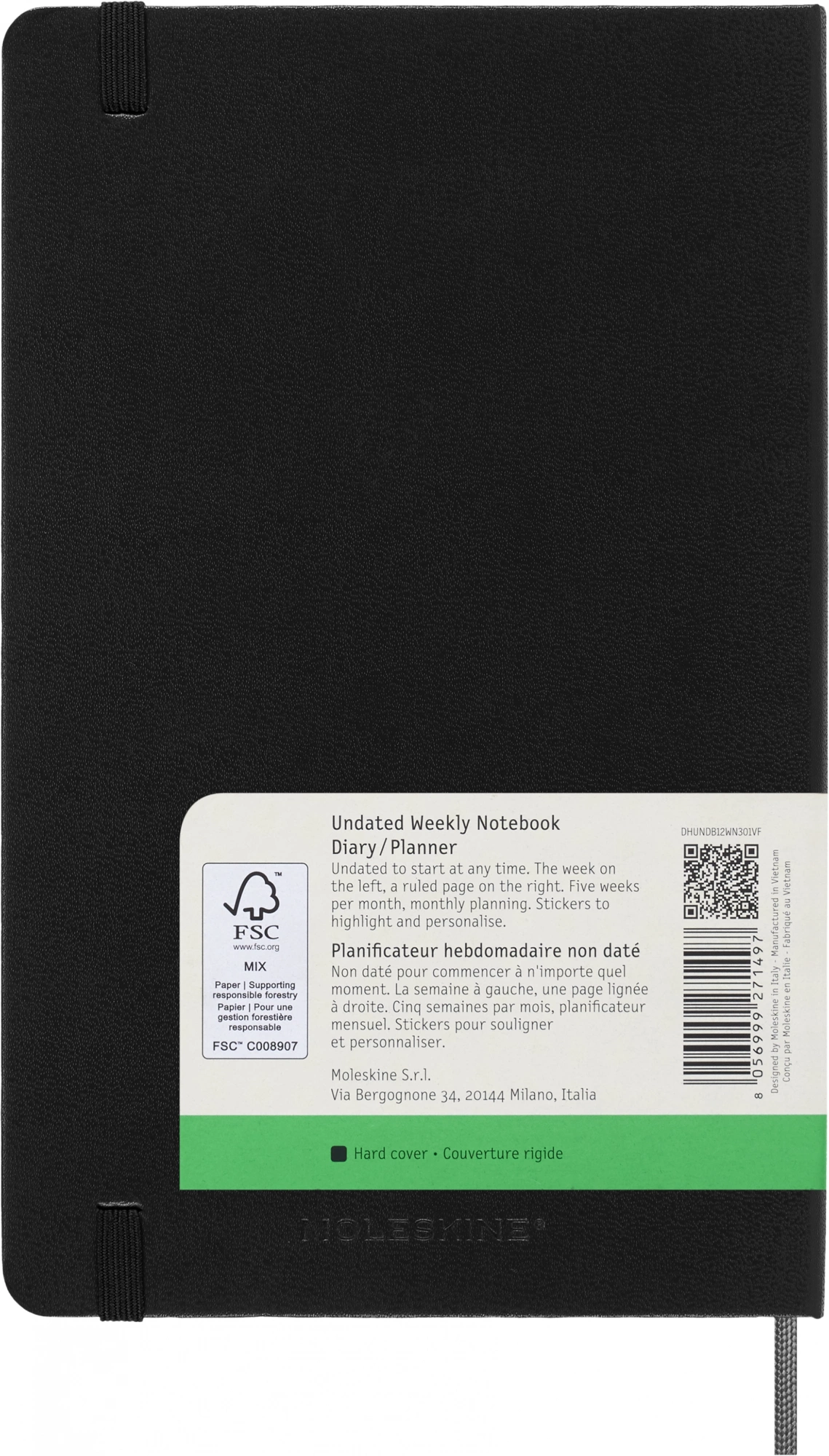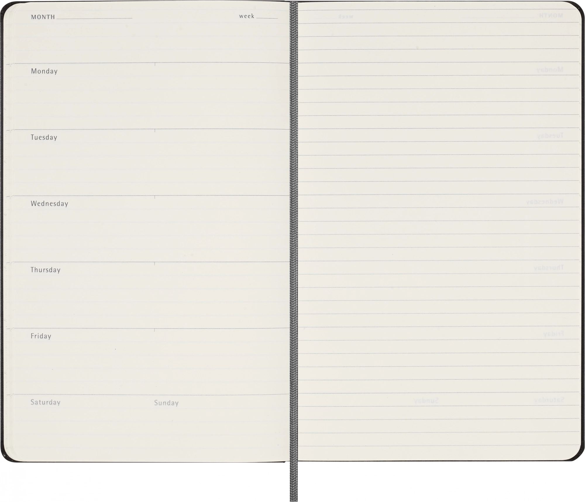 Записная книжка с недельным разворотом: на каждом двухстраничном развороте слева отображаются дни недели, а справа в вашем распоряжении будет линованная страница для заметок, списка дел и напоминаний. Такой универсальный формат сочетает в себе все достоинства записной книжки и планера. На каждый месяц отводится пять полных недатированных недель.
