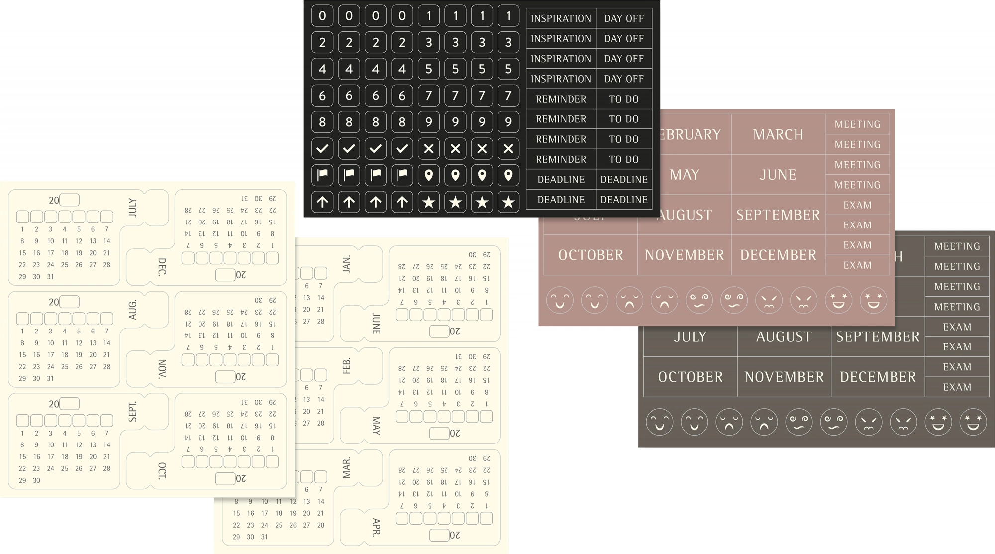 Контент для оптимизации вашего планирования: к недатированному классическому ежедневнику прилагается набор наклеек, в том числе наклейки месяцев для персонализации каждого из 12 разделителей. Также предусматриваются месячные министикеры-календари для заполнения и наклеивания на месячные разделители. Первые страницы этого планера содержат расписание и пространство для планирования путешествий, идей и целей.