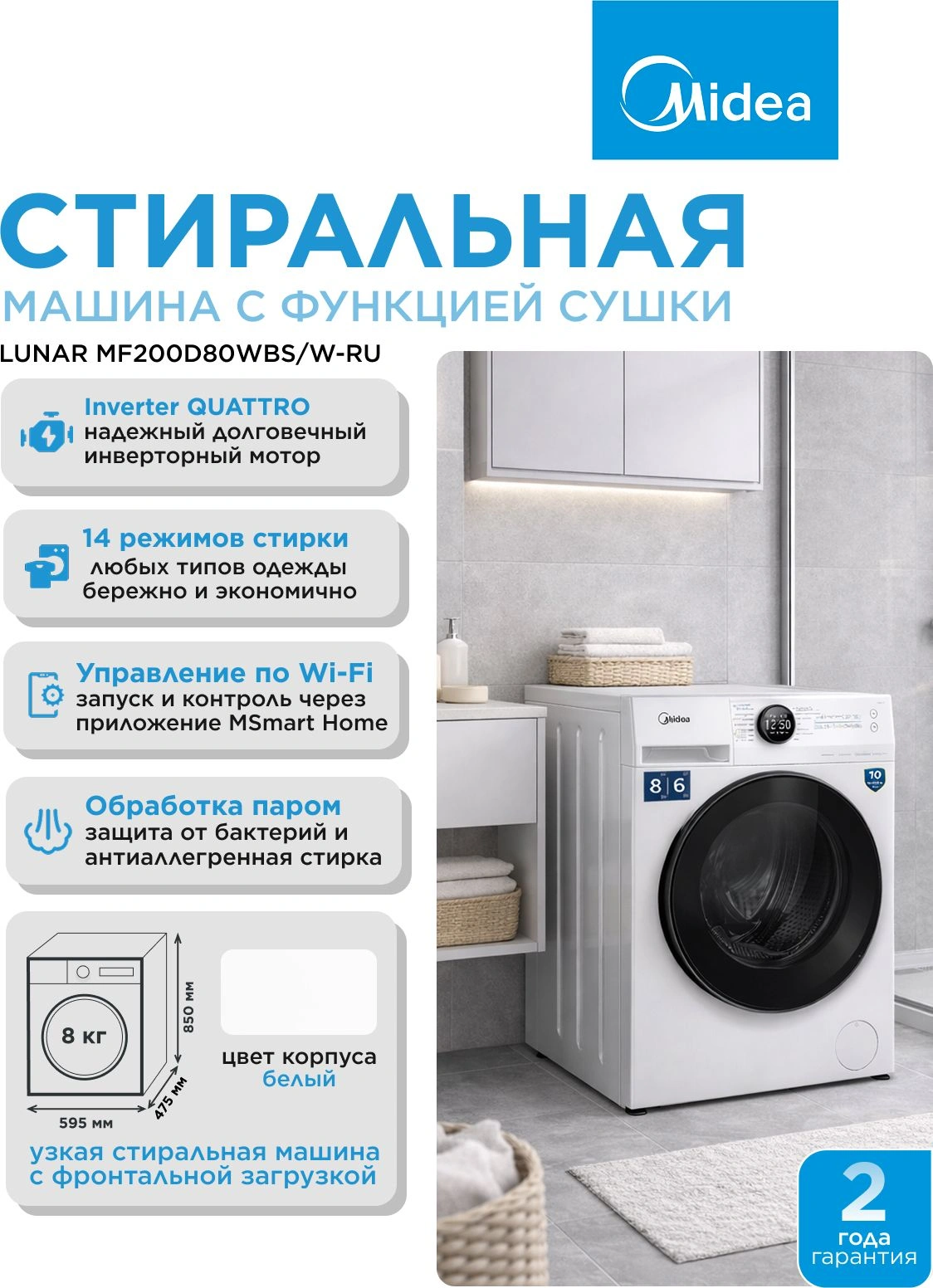 класс: A загр.фронтальная макс.:8кг (с сушкой) бел...