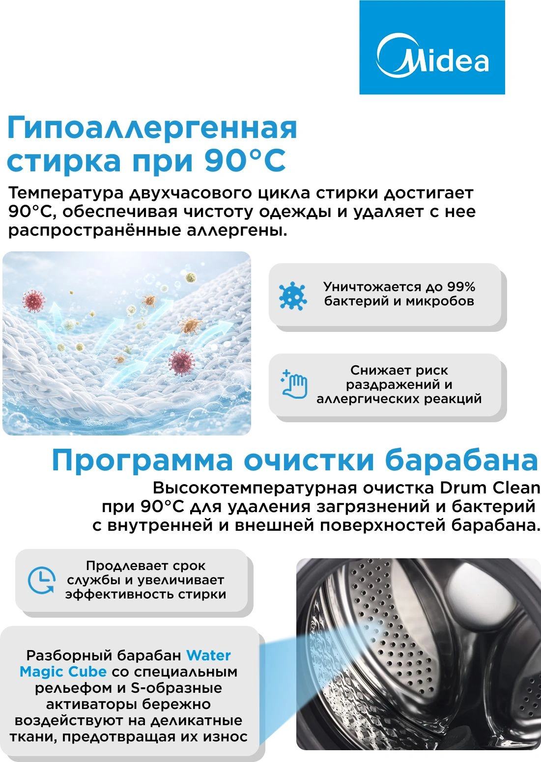 быстрая стирка, деликатная стирка, дополнительное полоскание, предварительная стирка, самоочистка, ускоренная стирка