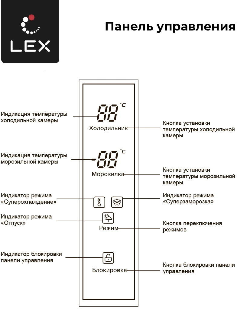 защита от детей, режим отпуск, суперзаморозка, суперохлаждение