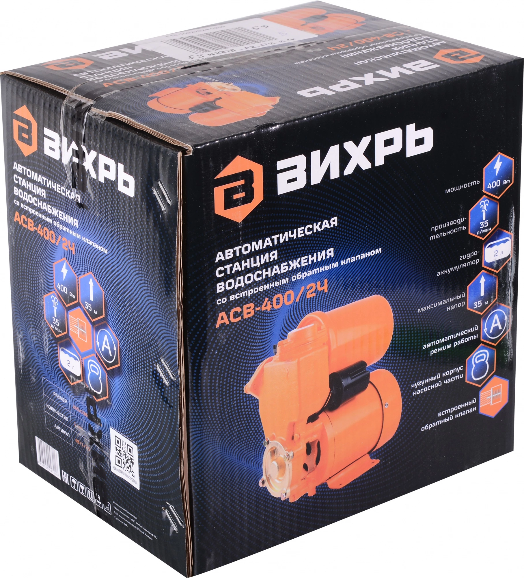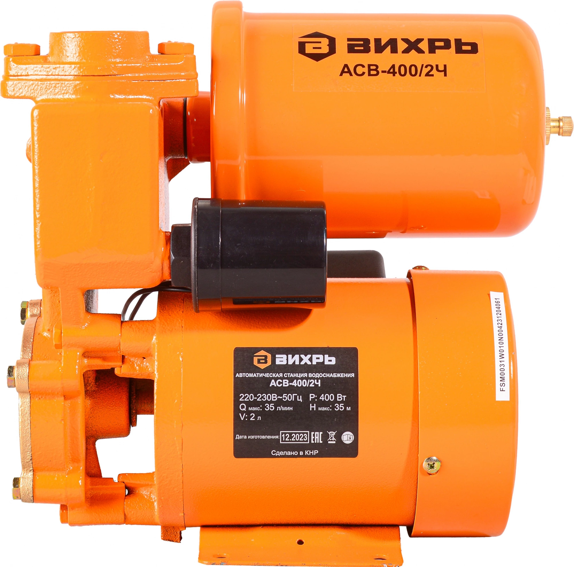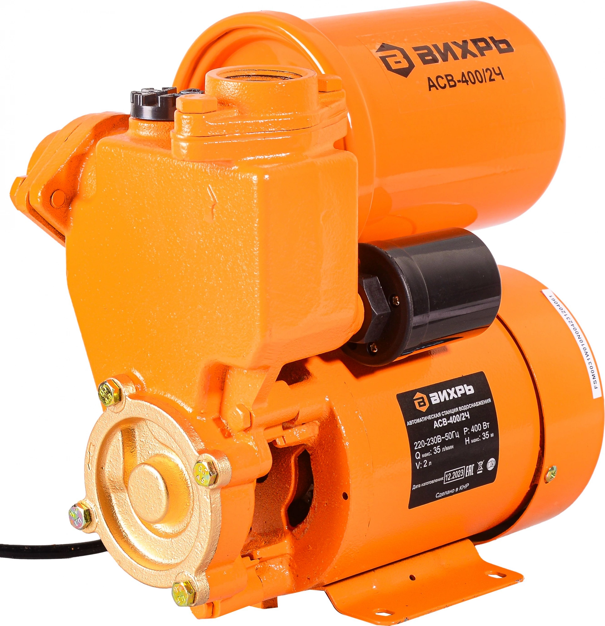 Максимальный напор 35 м. Ёмкость гидроаккумулятора 2 л. Максимальная глубина всасывания 9 м. Встроенный обратный клапан.