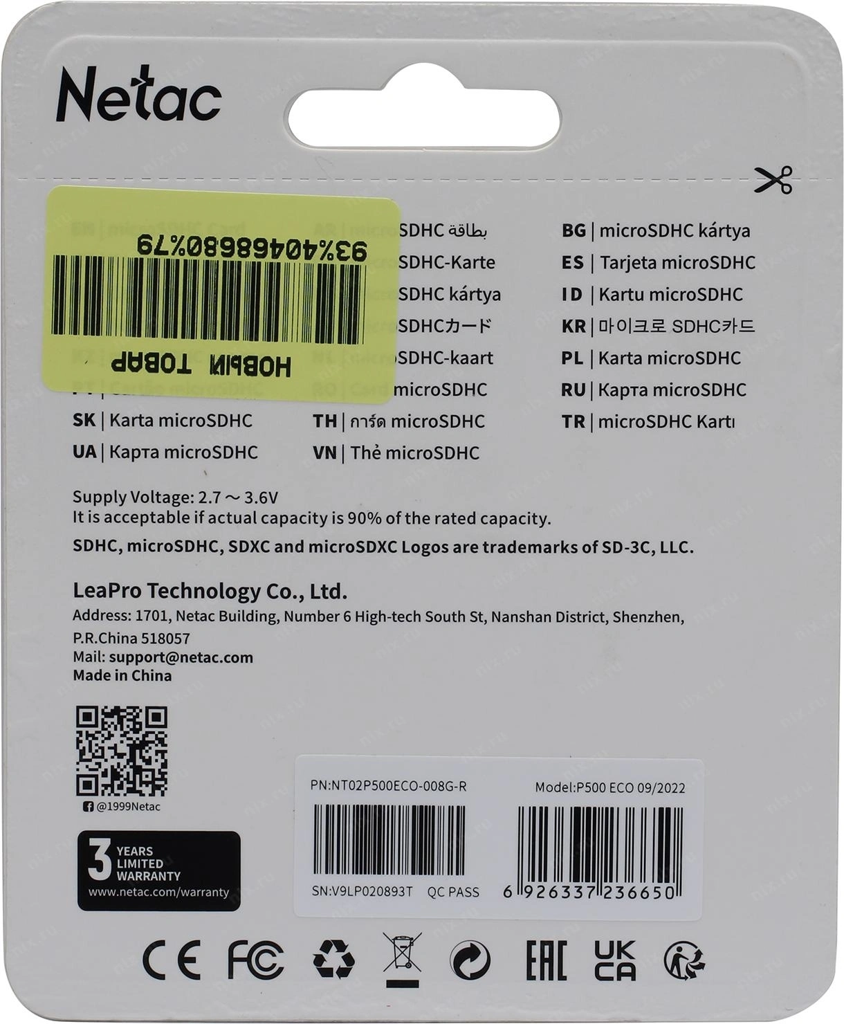 Флеш карта microSDHC 8GB Netac NT02P500ECO-008G-R