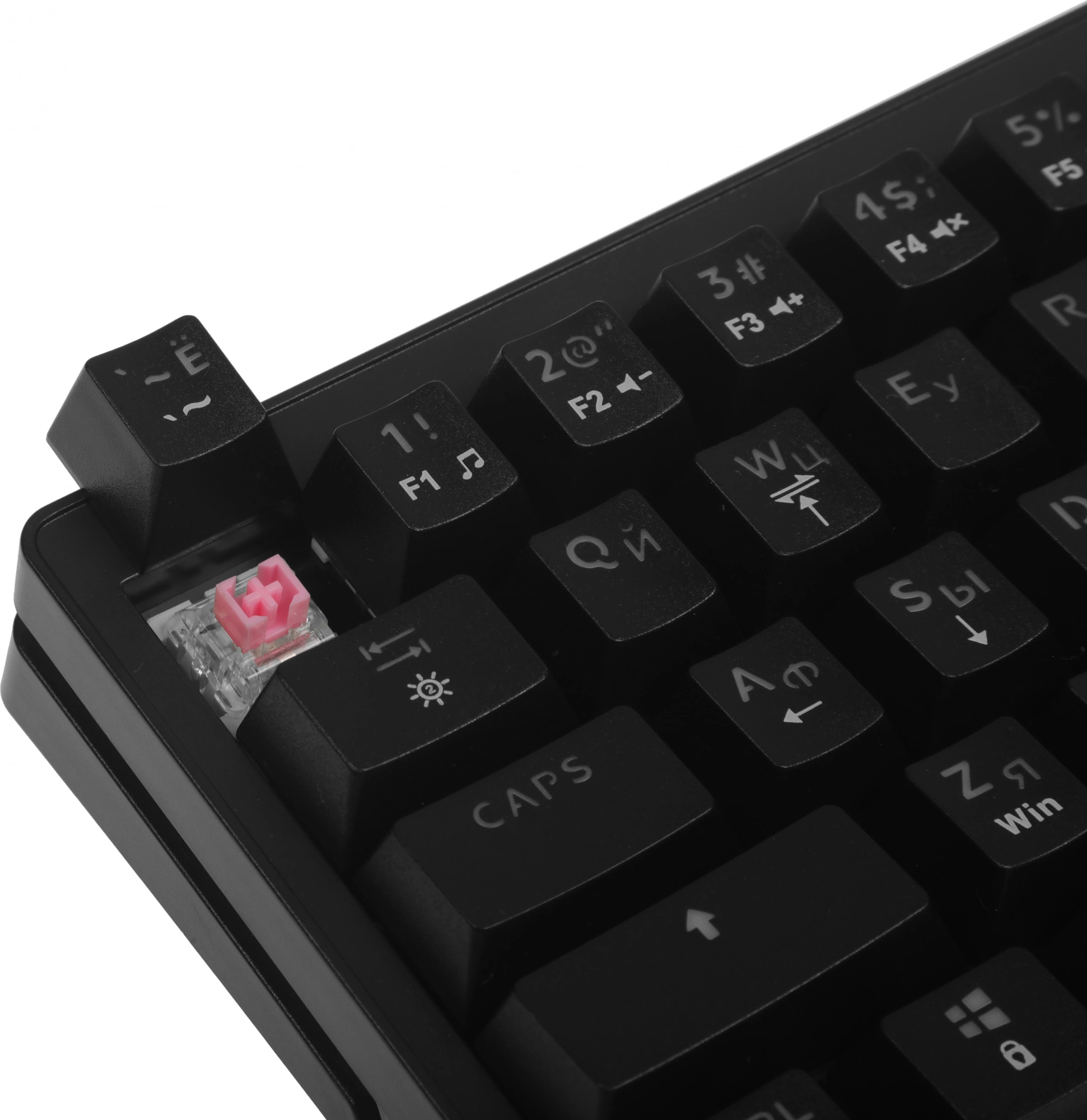 Компактная проводная механическая клавиатура с RGB подсветкой на линейных розовых свитчах TNT. Клавиатура имеет прочный корпус с шумоподавлением. В комплект входят 2 дополнительных свитча, а также пуллеры для кейкапов и свитчей.