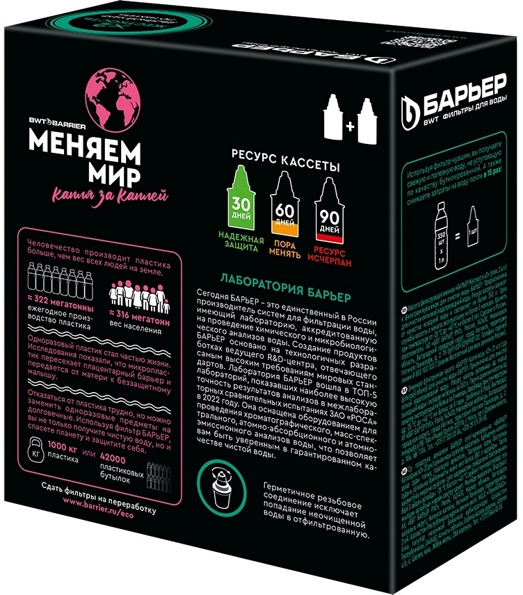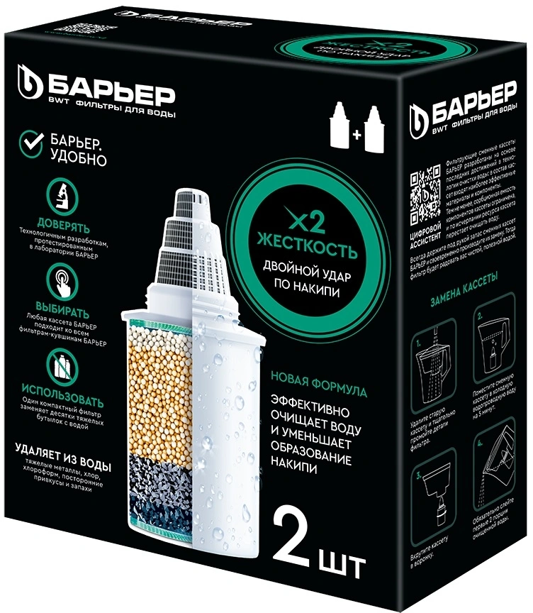 Специальная кассета для водопроводной воды с избыточным количеством солей жесткости. Очищает от: растворенных солей кальция и магния (накипь), хлора и хлорорганических соединений, пестицидов, аПАВ, нефтепродуктов, железа. Подходит для всех фильтров-кувшинов БАРЬЕР.