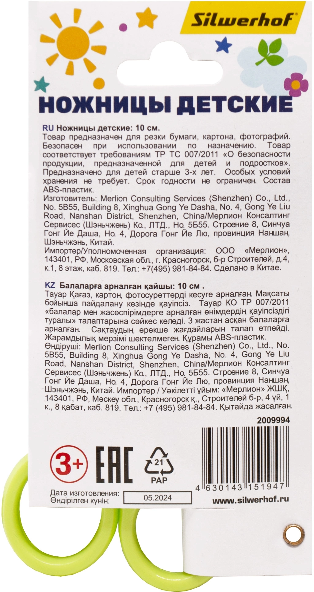 Ножницы Silwerhof Create детские 100мм ручки пластиковые пластик салатовый