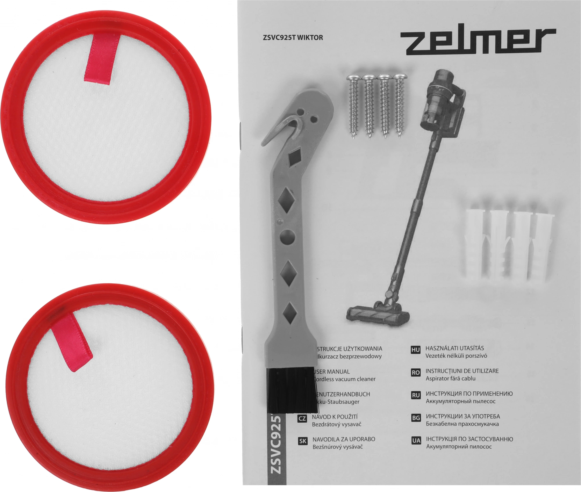 Складная трубка; 2 щеточных валика для всех типов полов; ; Шланг, 2 внутренних фильтра;