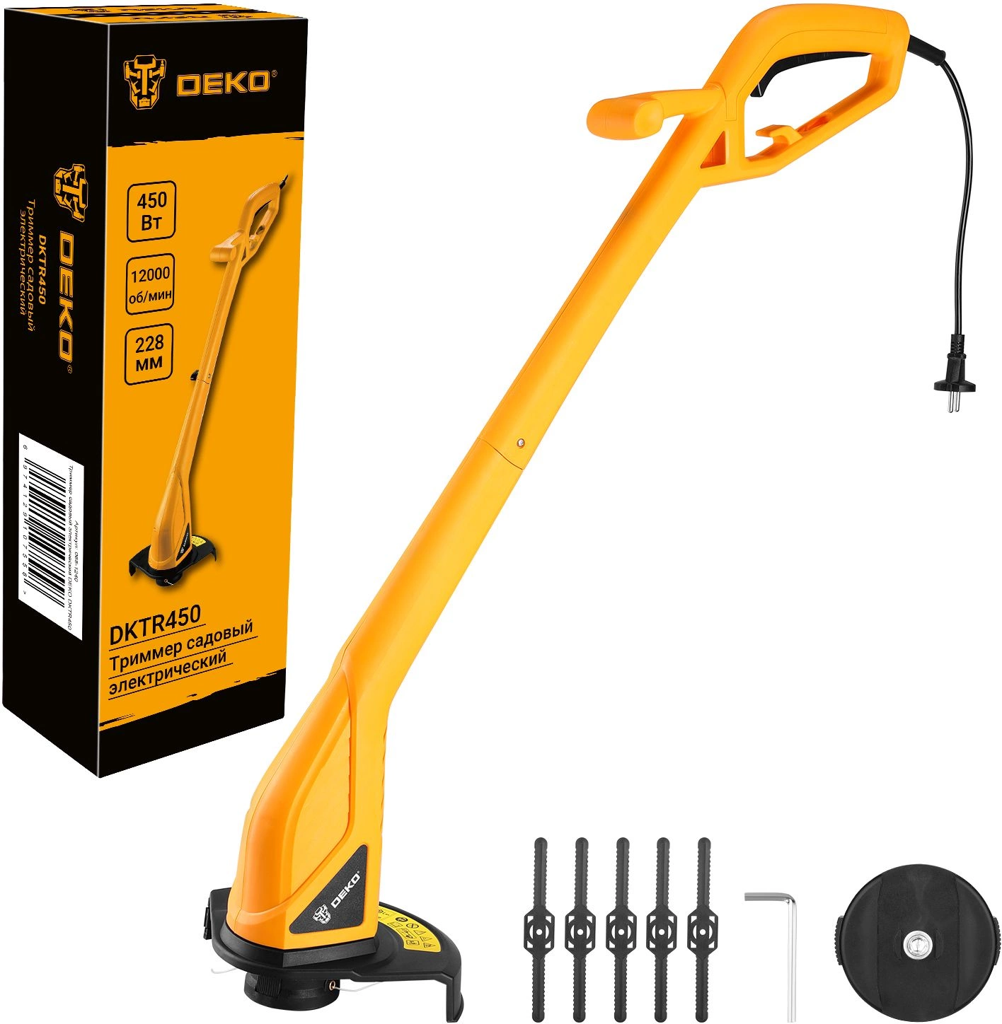 Катушка с леской (установлена на триммер) - 1 шт, Триммерная головка для пластиковых ножей - 1 шт, Защитный кожух - 1 шт, Пластиковые ножи - 5 шт, Шестигранный ключ - 1 шт, Крепежный комплект (винт - 1 шт, саморезы - 3 шт, шайба - 1 шт) - 1 шт