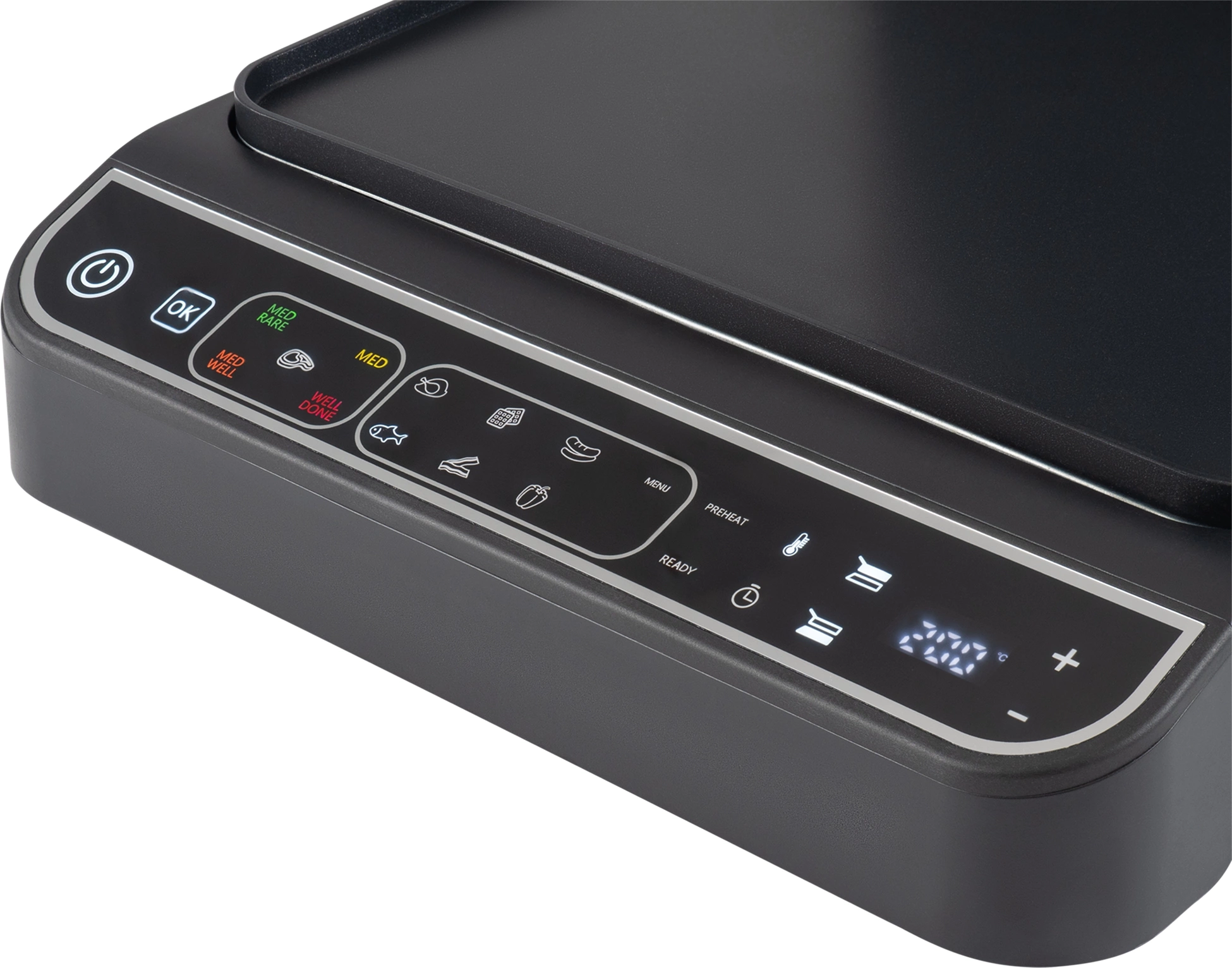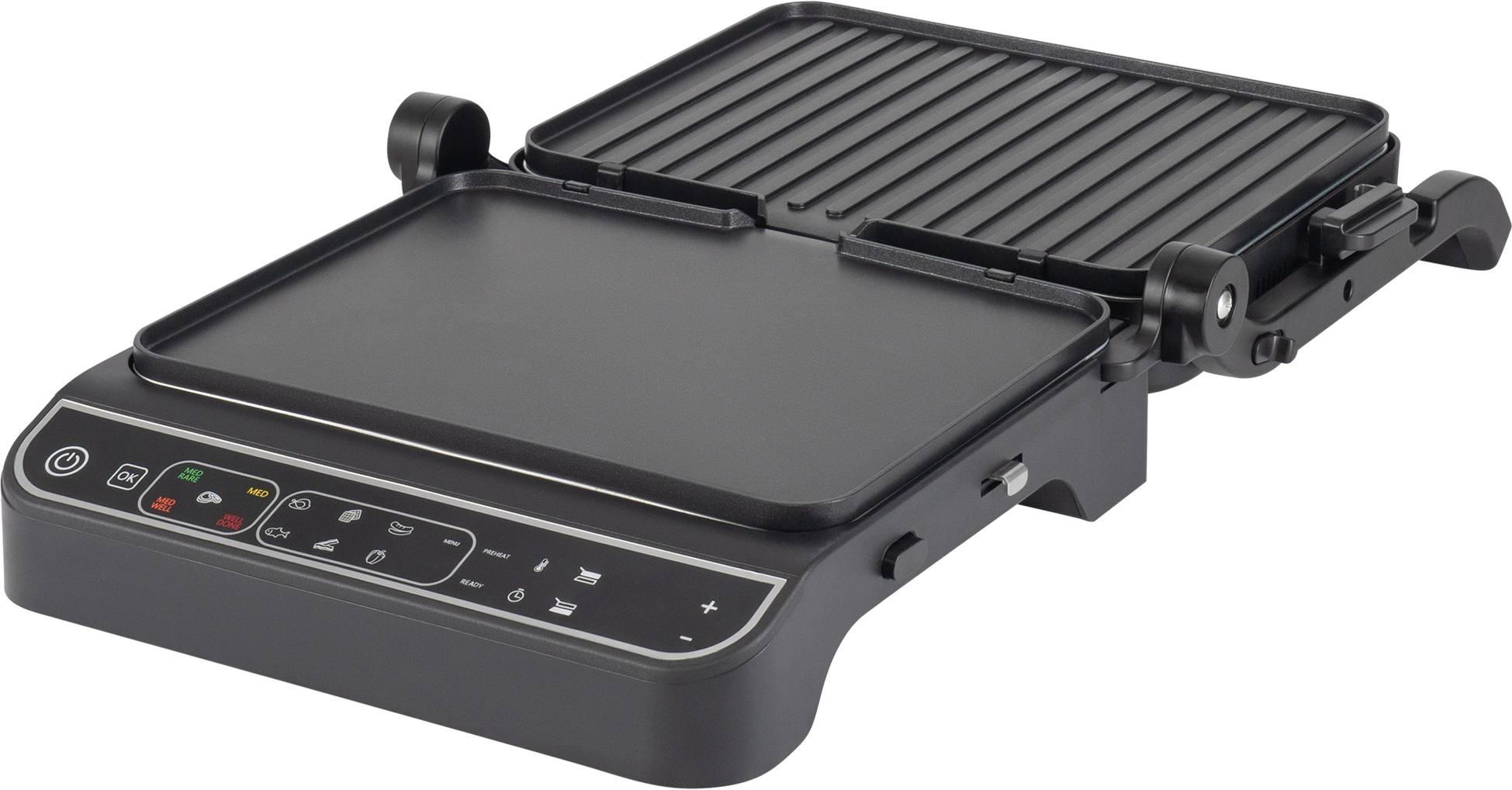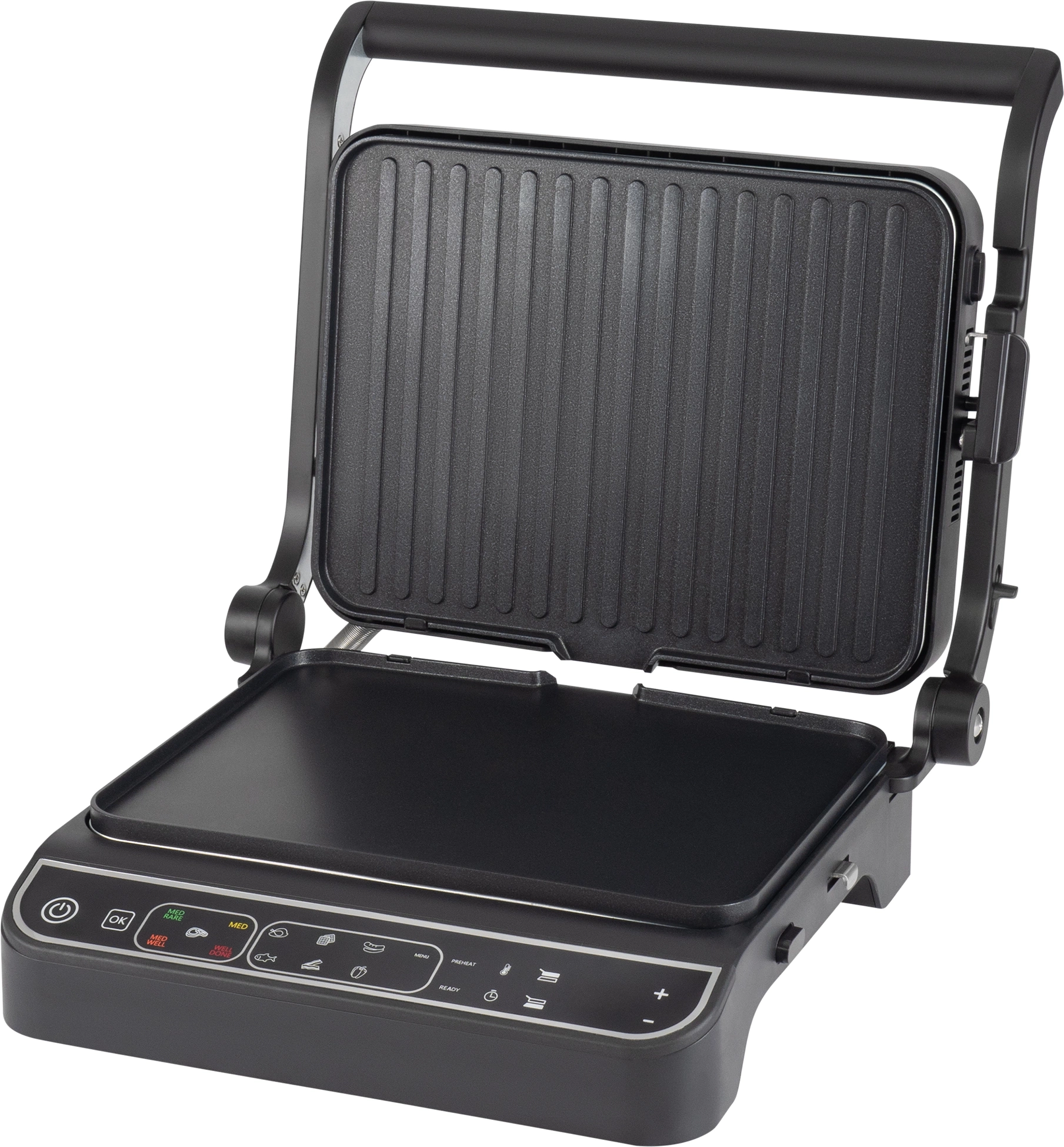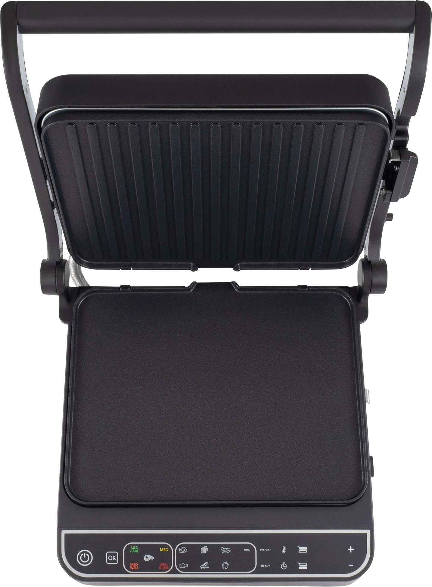 10 автоматических программ для приготовления, а так же ручной режим, для оптимальных настроек для каждого типа продуктов. Открытие на 180°, плоская панель и раздельная регулировка температуры панелей, позволяет использовать гриль как плиту.