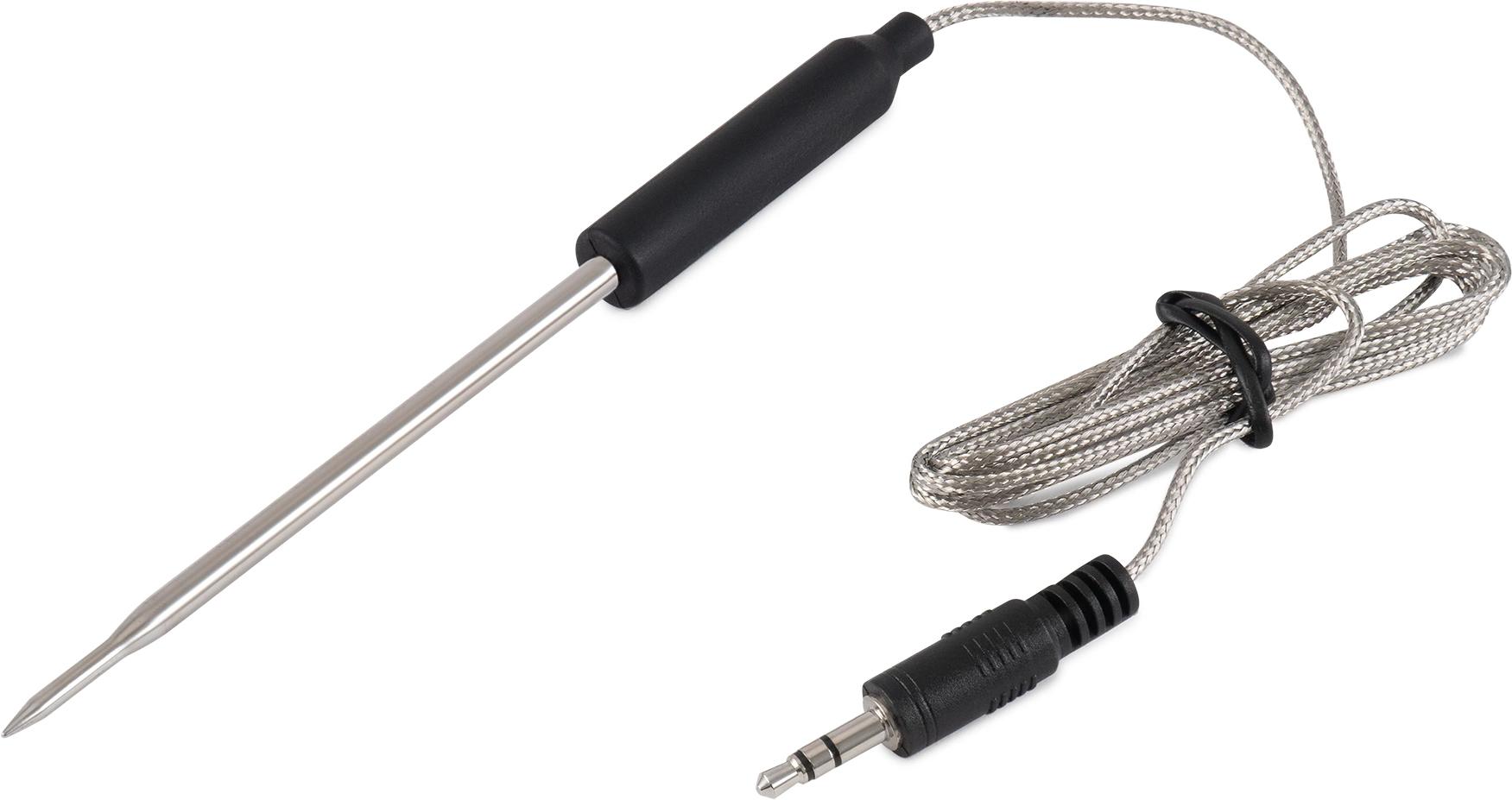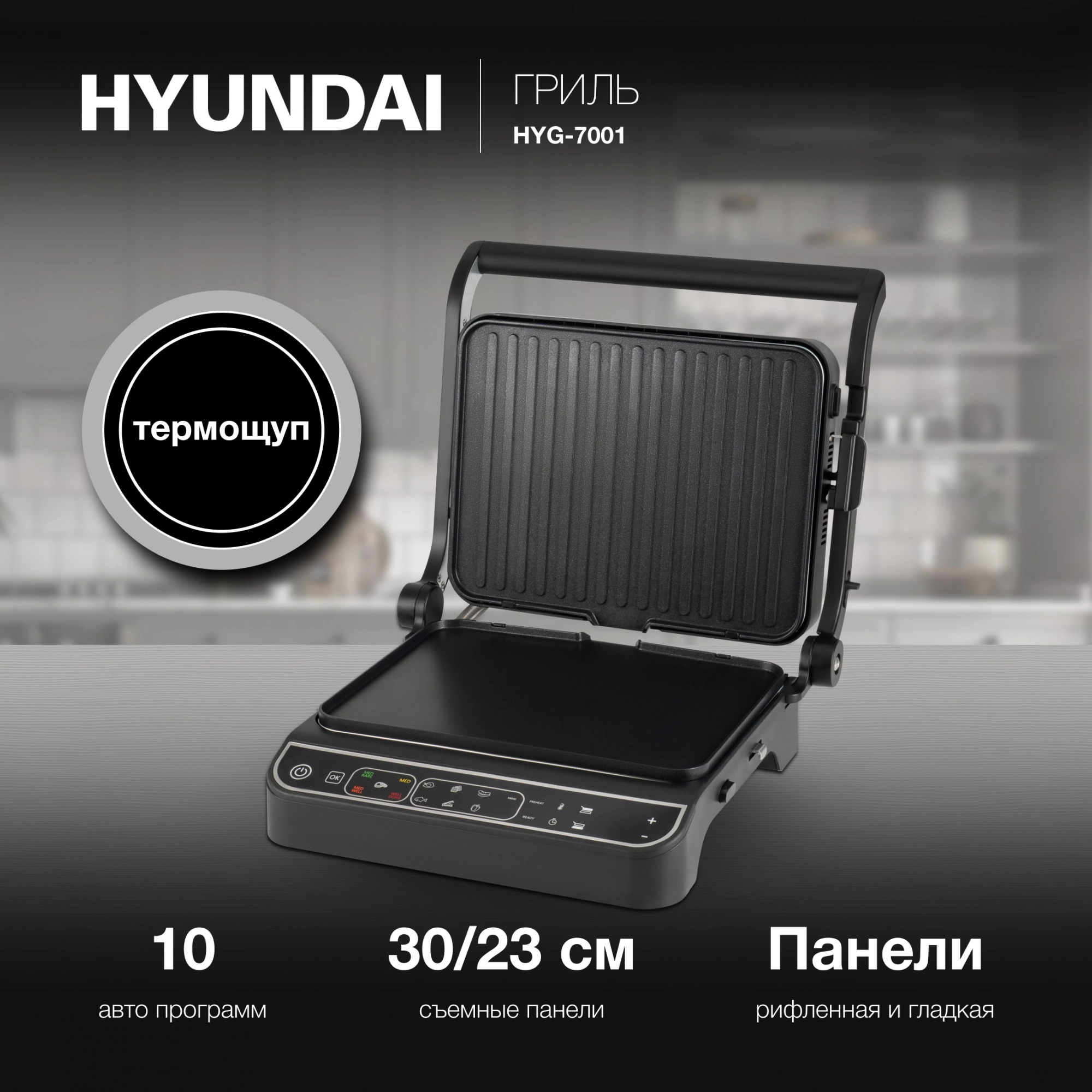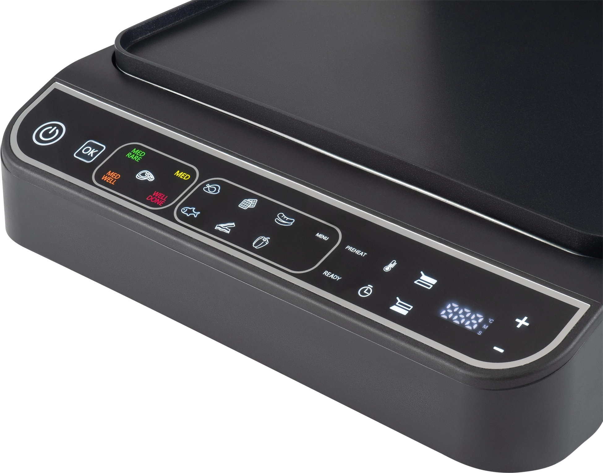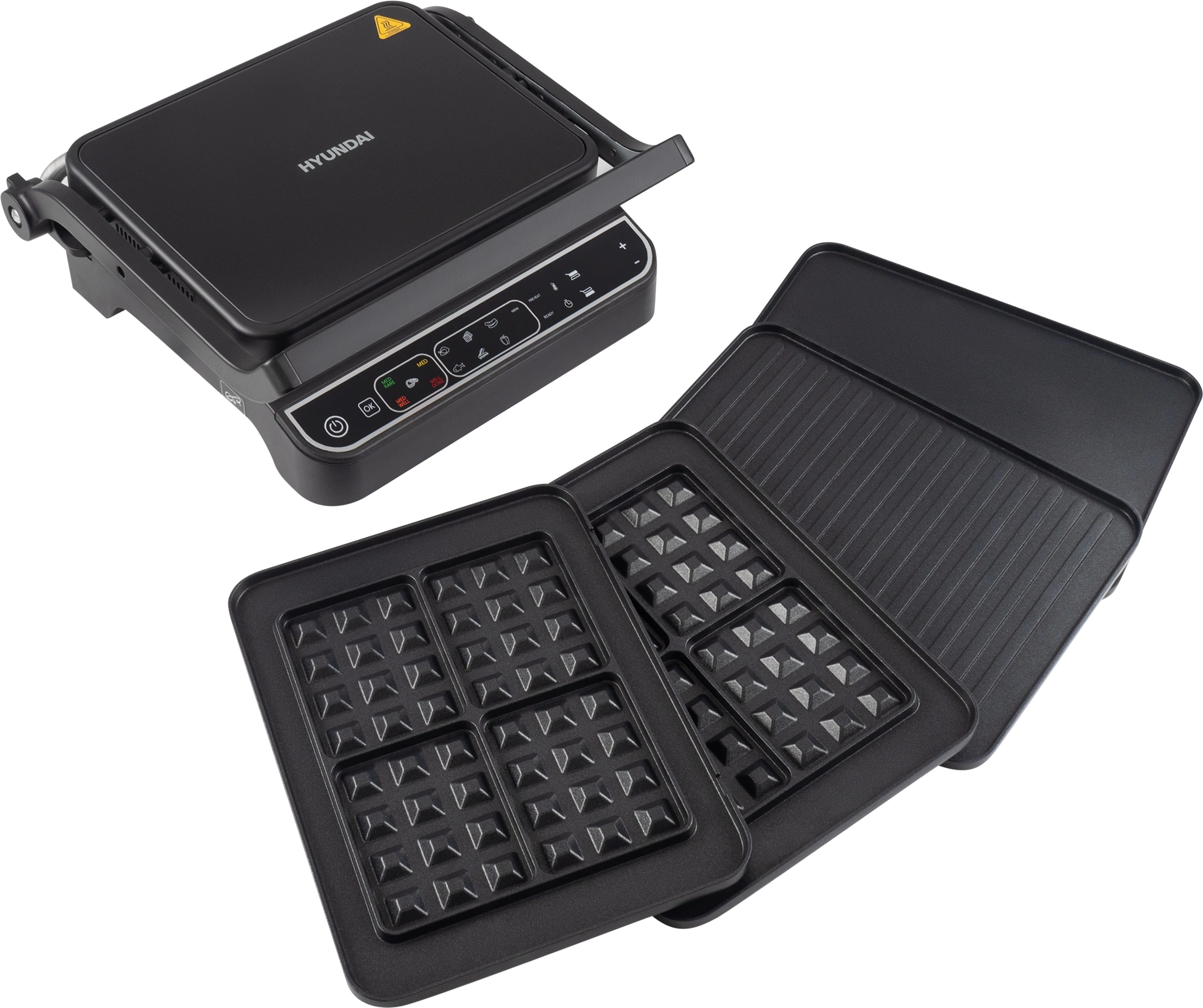 Термощуп обеспечивает автоматический контроль температуры внутри стейка, тем самым контролирует степень прожарки. Панели для приготовления вафель в комплекте.