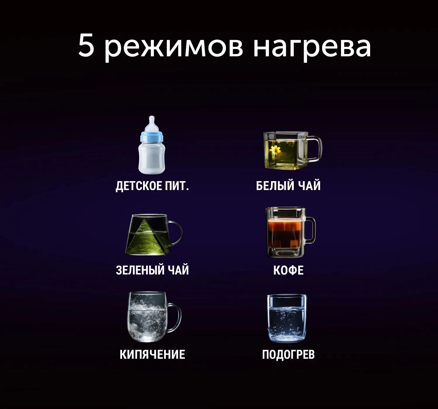 5 программ: детское питание, белый чай, зеленый чай, кофе, кипячение