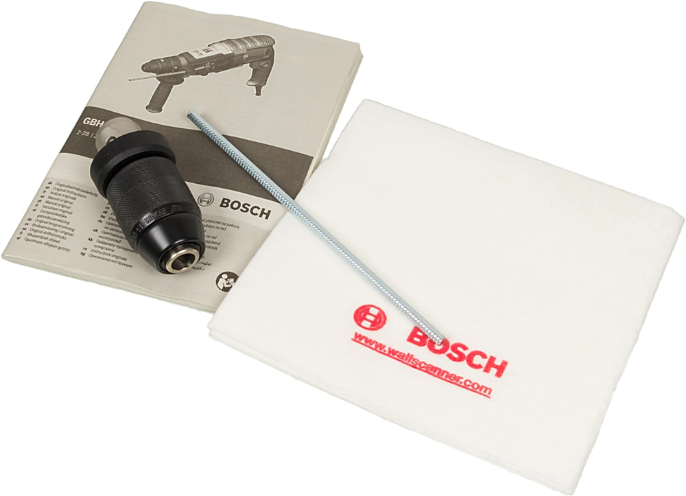 Перфоратор, дополнительный патрон, дополнительная рукоятка, глубиномер, инструкция, кейс.