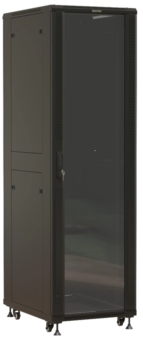 Шкаф серверный Hyperline (TTBR-4261-AS-RAL9004) напольный 42U 600x1000мм пер.дв.стекл задн.дв.спл.стал.лист 2 бок.пан. 800кг черный 910мм 128.2кг 2055мм IP20 сталь