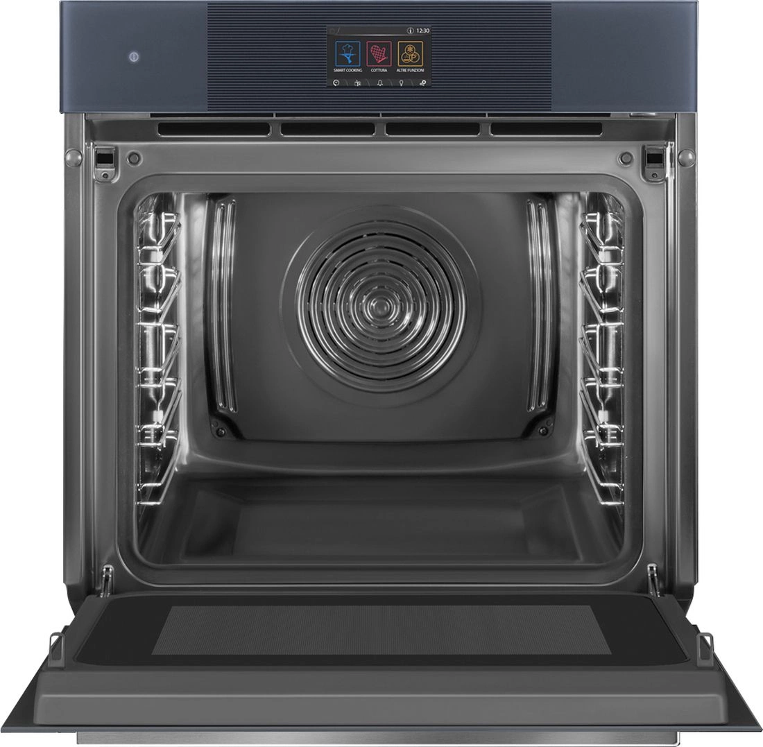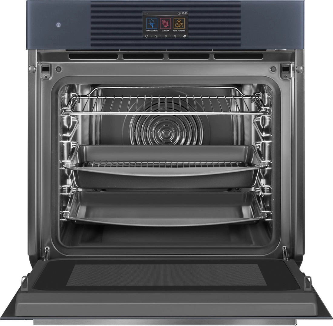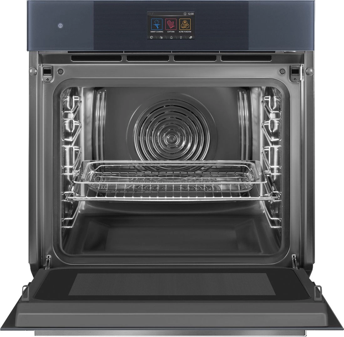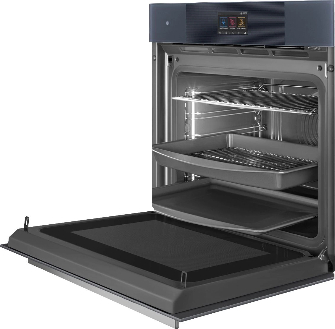 вентилятор охлаждения, дисплей, доводчик двери, полностью стеклянная внутренняя поверхность дверцы духовки, телескопические направляющие, термощуп, электронный программатор