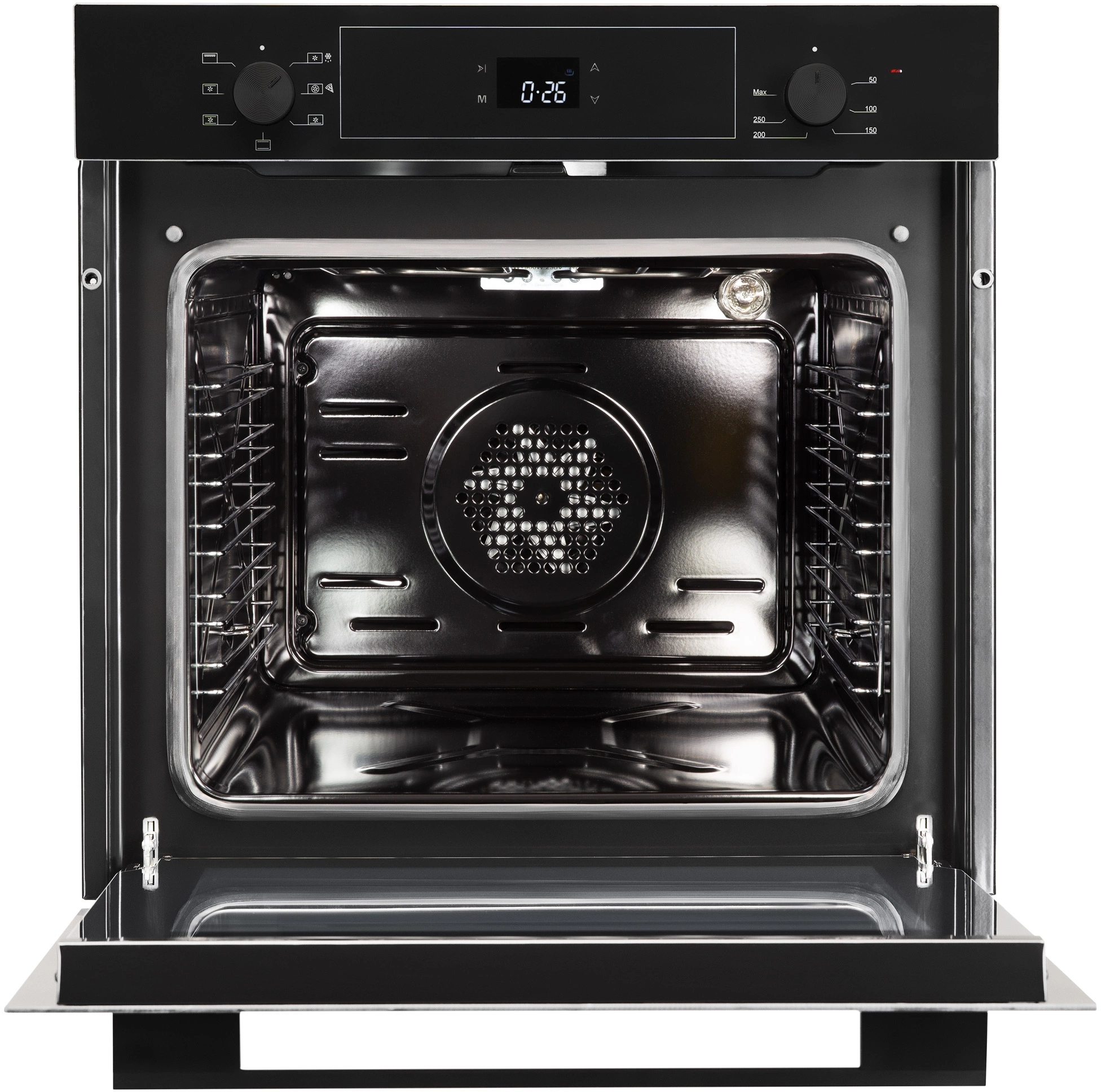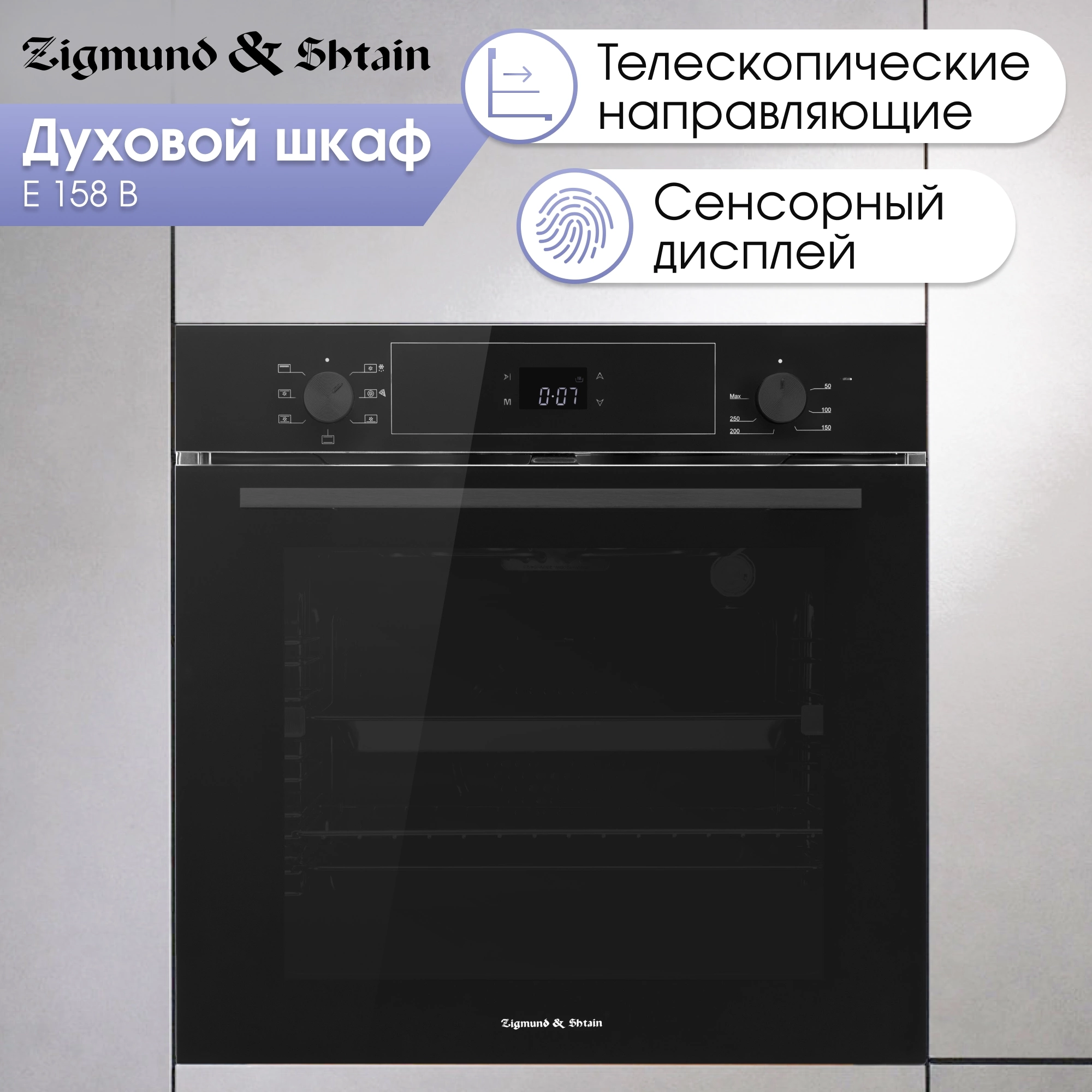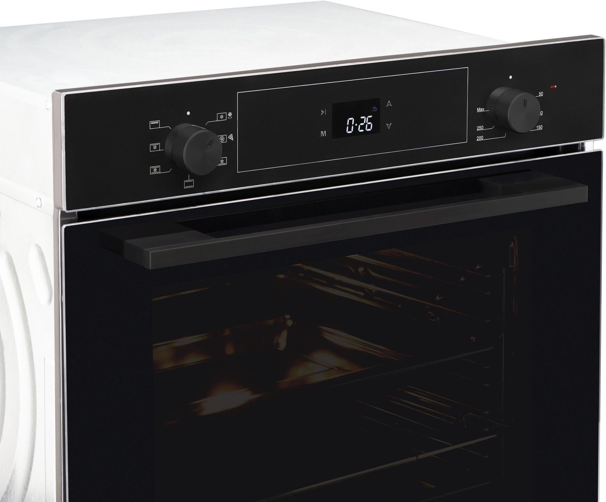 вентилятор охлаждения, дисплей, полностью стеклянная внутренняя поверхность дверцы духовки, телескопические направляющие, электронный программатор