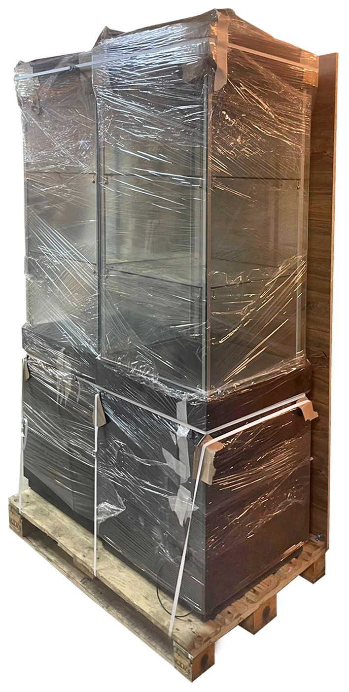 Упаковка витрины состоит из стрейч пленки, гофрокороба, которые зашиты в брус из массива