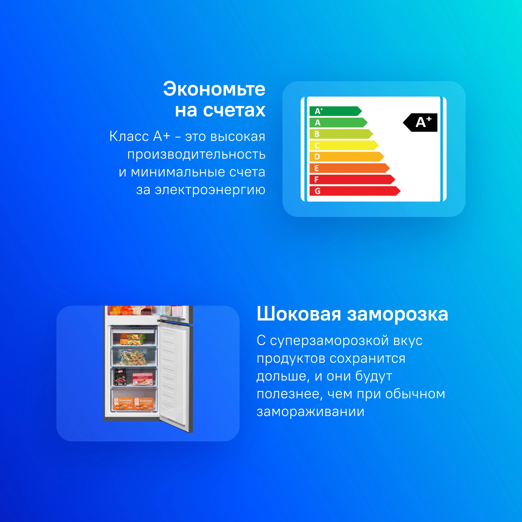 Full No Frost, двухконтурная система охлаждения. Технология сохранения свежести Harvest Fresh. Режим "Отпуск".