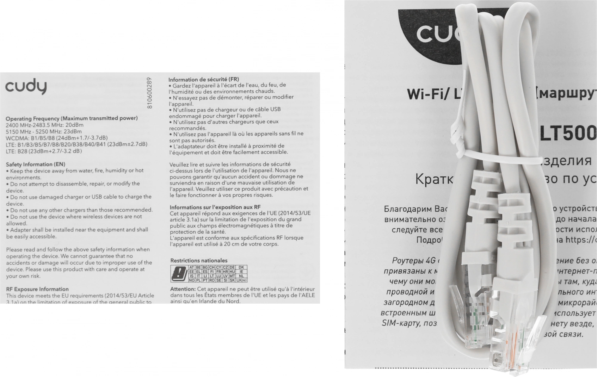 4G LTE WiFi роутер, адаптер питания, RJ45 Ethernet кабель, руководство быстрой установки