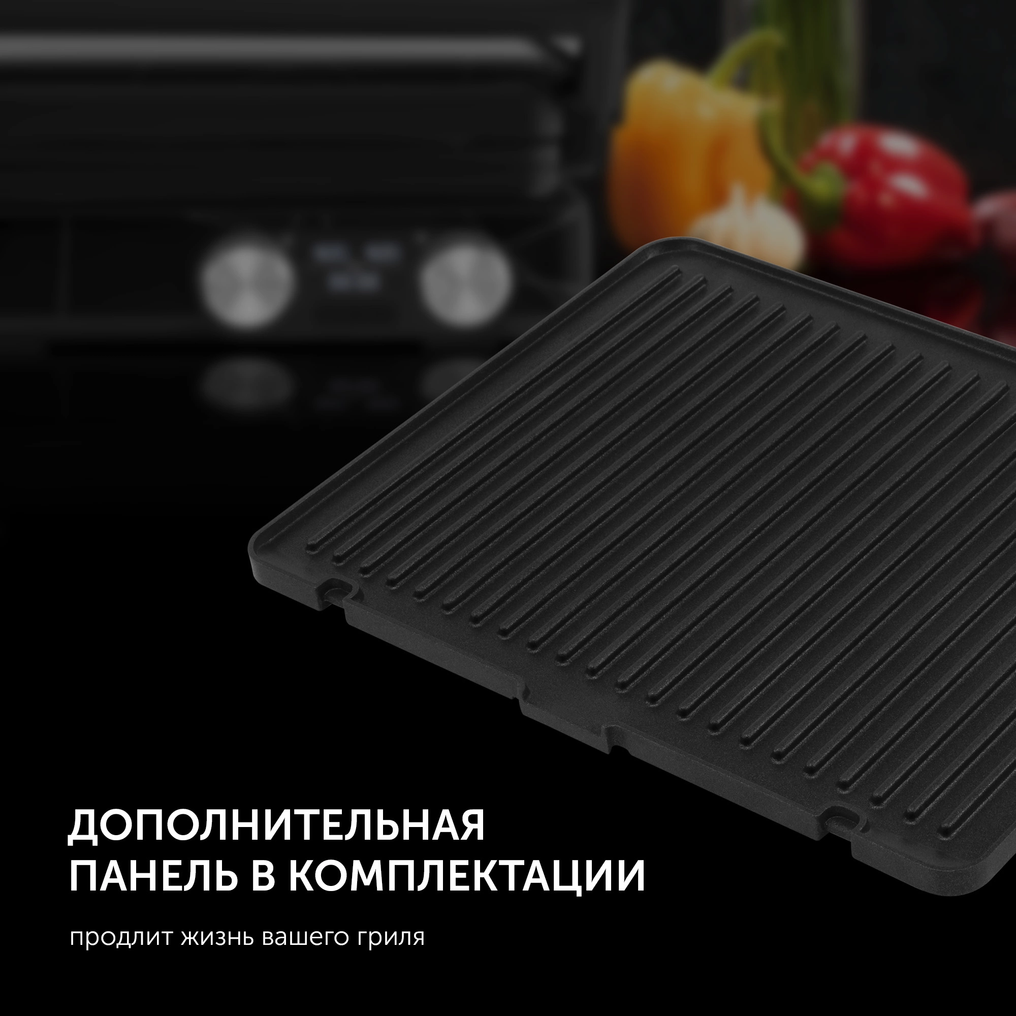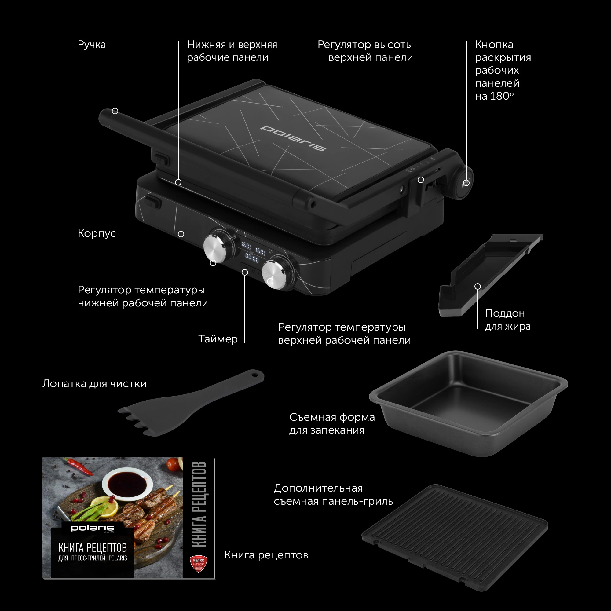 3 панели, поддон, лопатка для очистки панелей, съемная форма для запекания, дополнительная панель гриль, книга рецептов