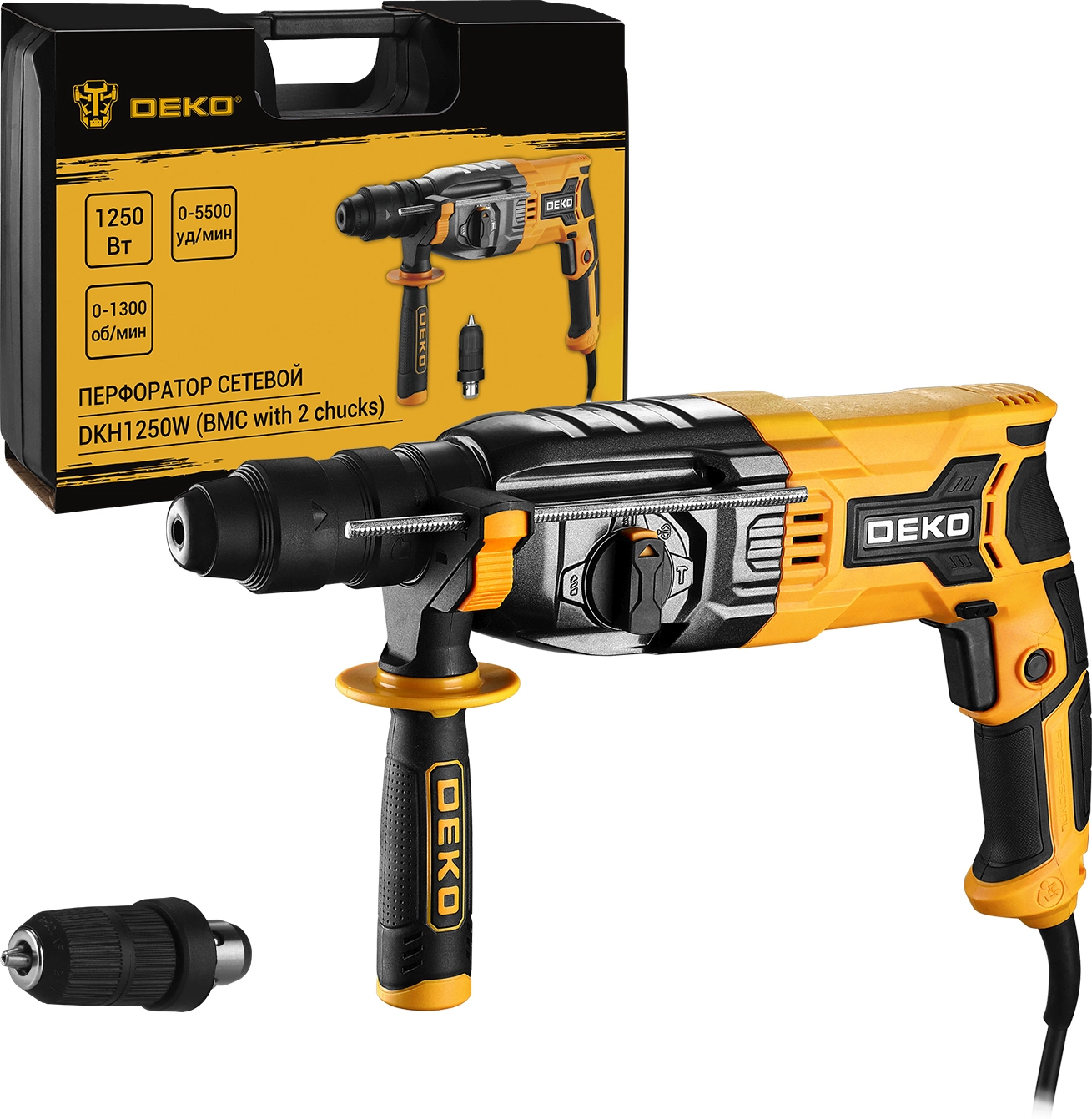 Перфоратор, глубиномер, дополнительный патрон (быстрозажимной), угольные щетки - 2 шт., руководство по эксплуатации, кейс.