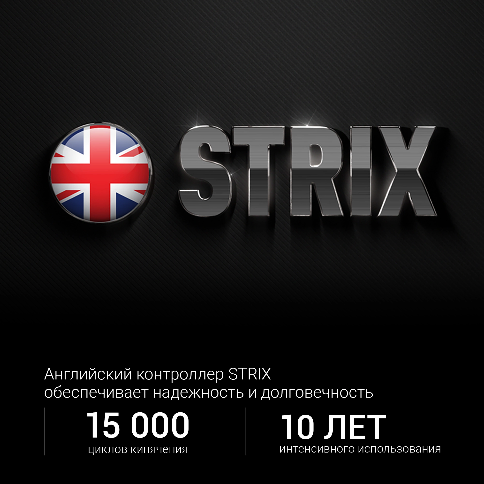 Английский контроллер Strix обеспечивает 15 000 циклов кипячения, что равно 10 годам интенсивного использования.