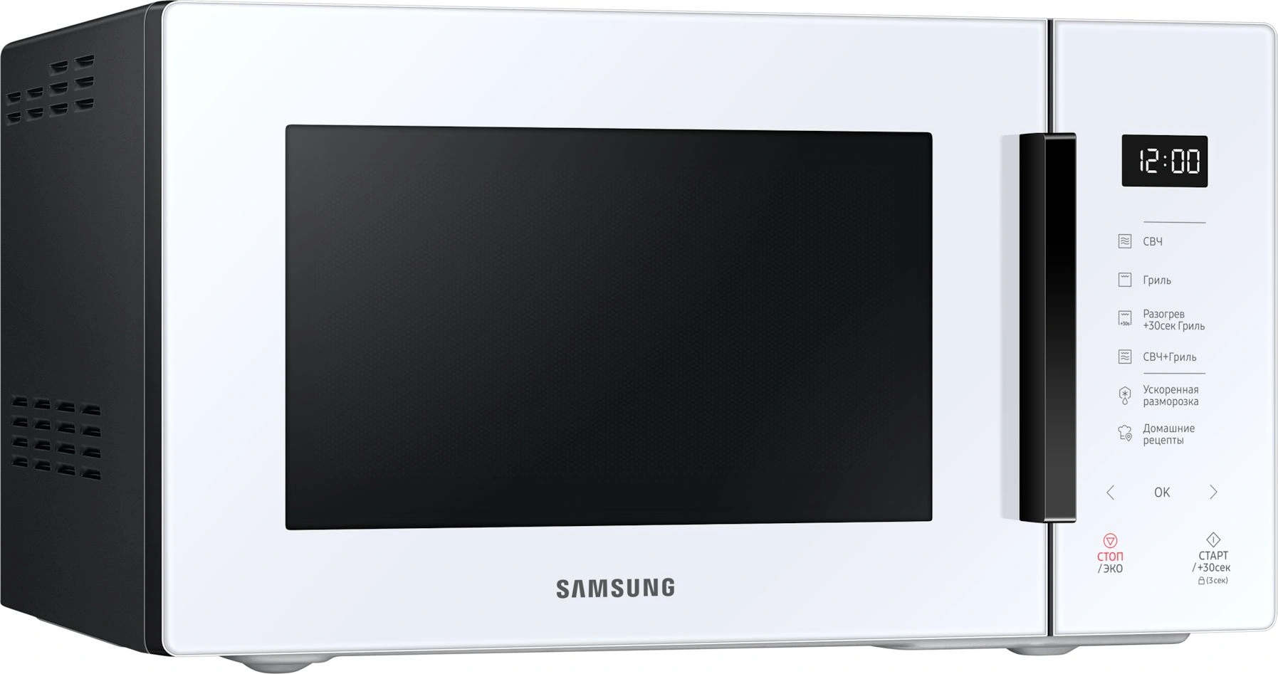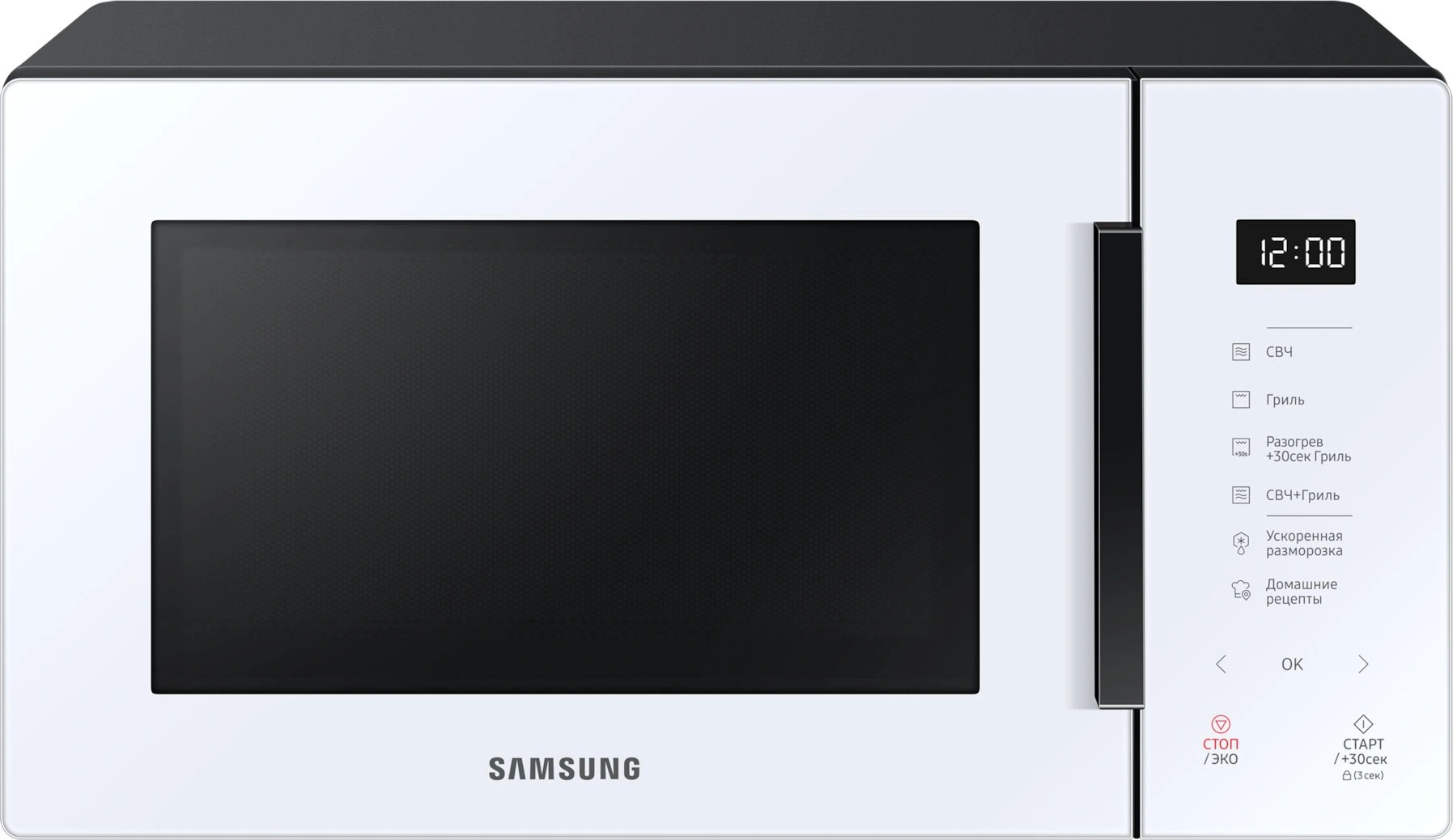 быстрый старт, звуковой сигнал окончания приготовления, кнопка +30 секунд, отключение сигнала, пауза, регулировка мощности