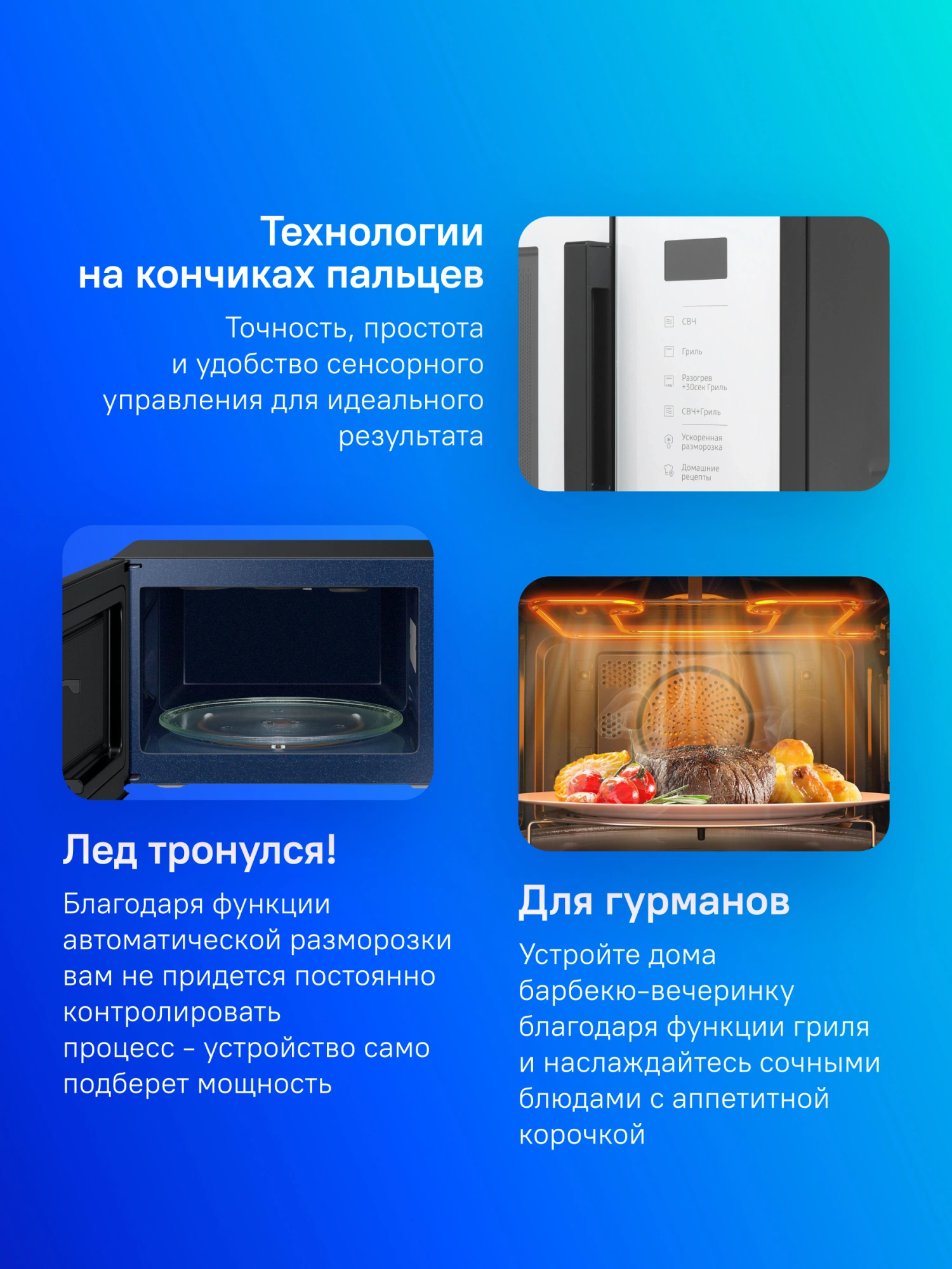 автоматическая разморозка, автоматический разогрев, автоматическое приготовление, гриль