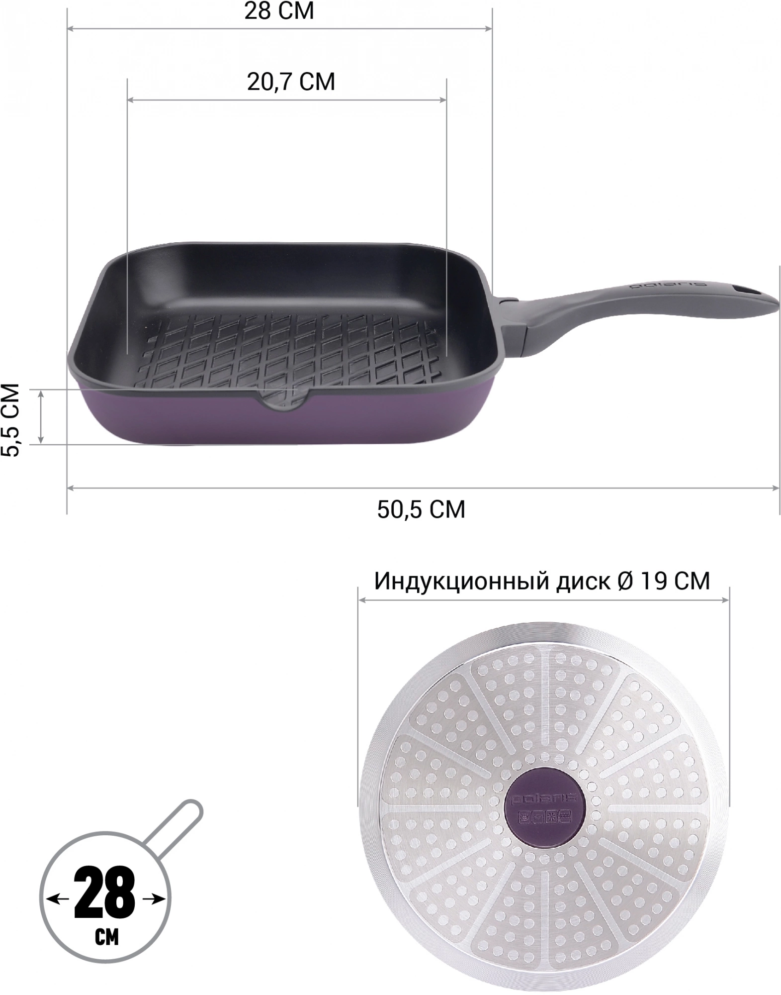 Подходит для всех типов плит, включая индукционные; бакелитовая ручка с покрытием "Soft-touch"; внутреннее высокопрочное 3х-слойное антипригарное покрытие ILAG обеспечивает непревзойденную стойкость к царапинам.