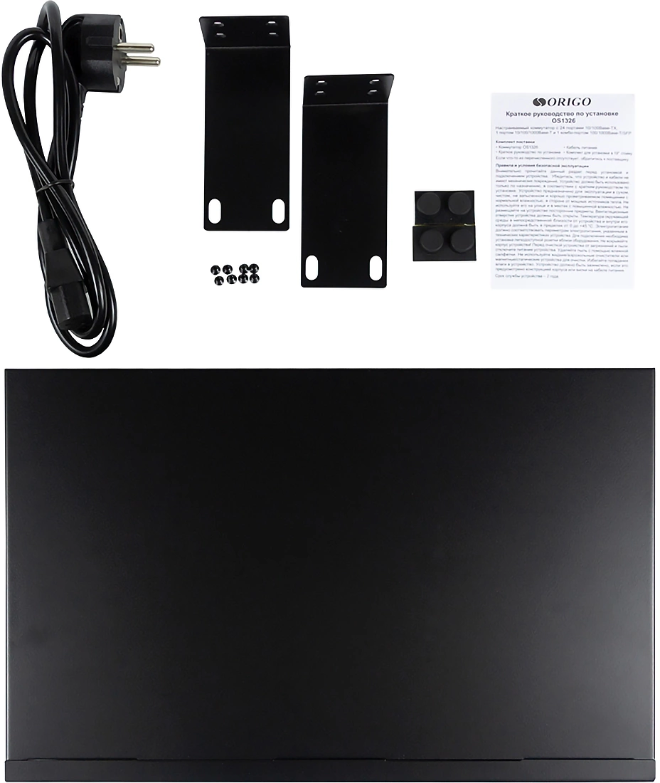коммутатор OS1326 - 1 шт, кабель питания - 1 шт, комплект для установки в 19-дюймовую стойку - 1 шт, документация