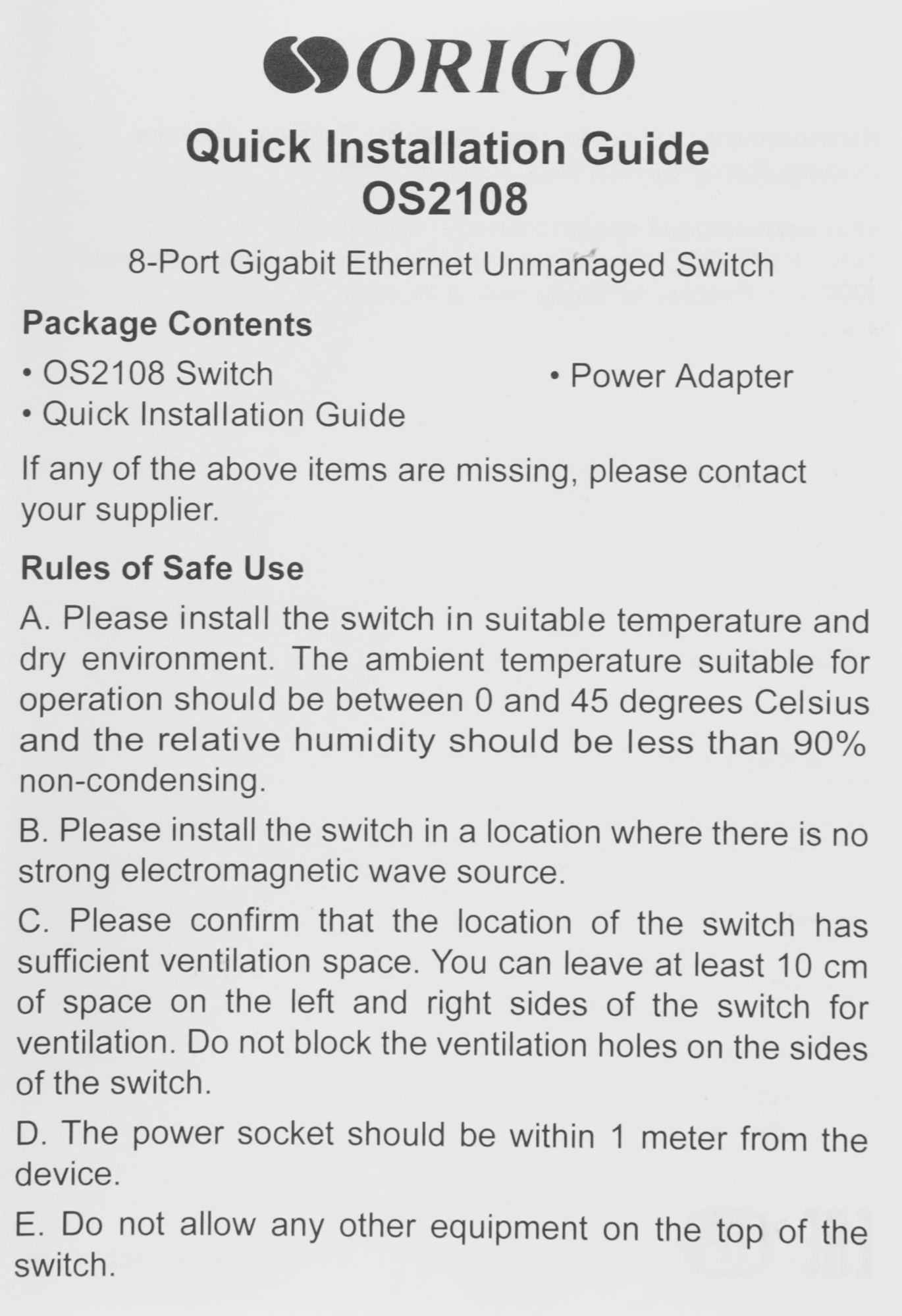 Коммутатор OS2108, адаптер питания, краткое руководство по установке