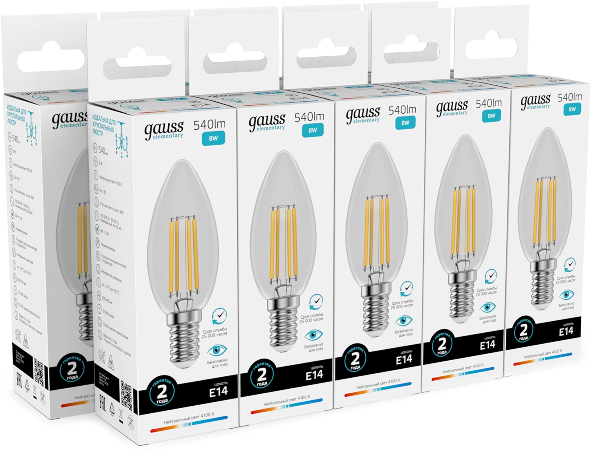 Лампа филам. Gauss Filament 8Вт цок.:E14 свеча 220B св.свеч.бел.нейт. (упак.:10шт) (32128)