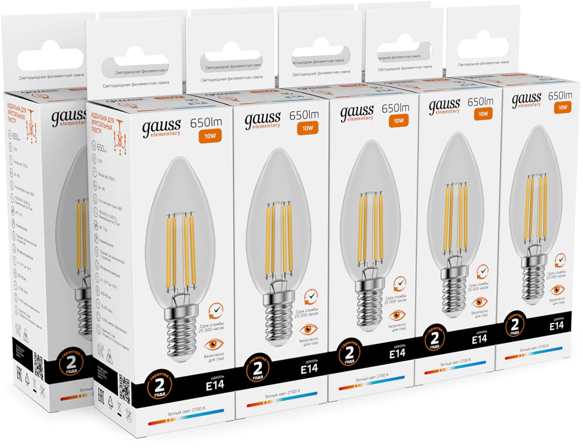 Лампа филам. Gauss Filament 10Вт цок.:E14 свеча 220B св.свеч.бел.теп. (упак.:10шт) (32110)