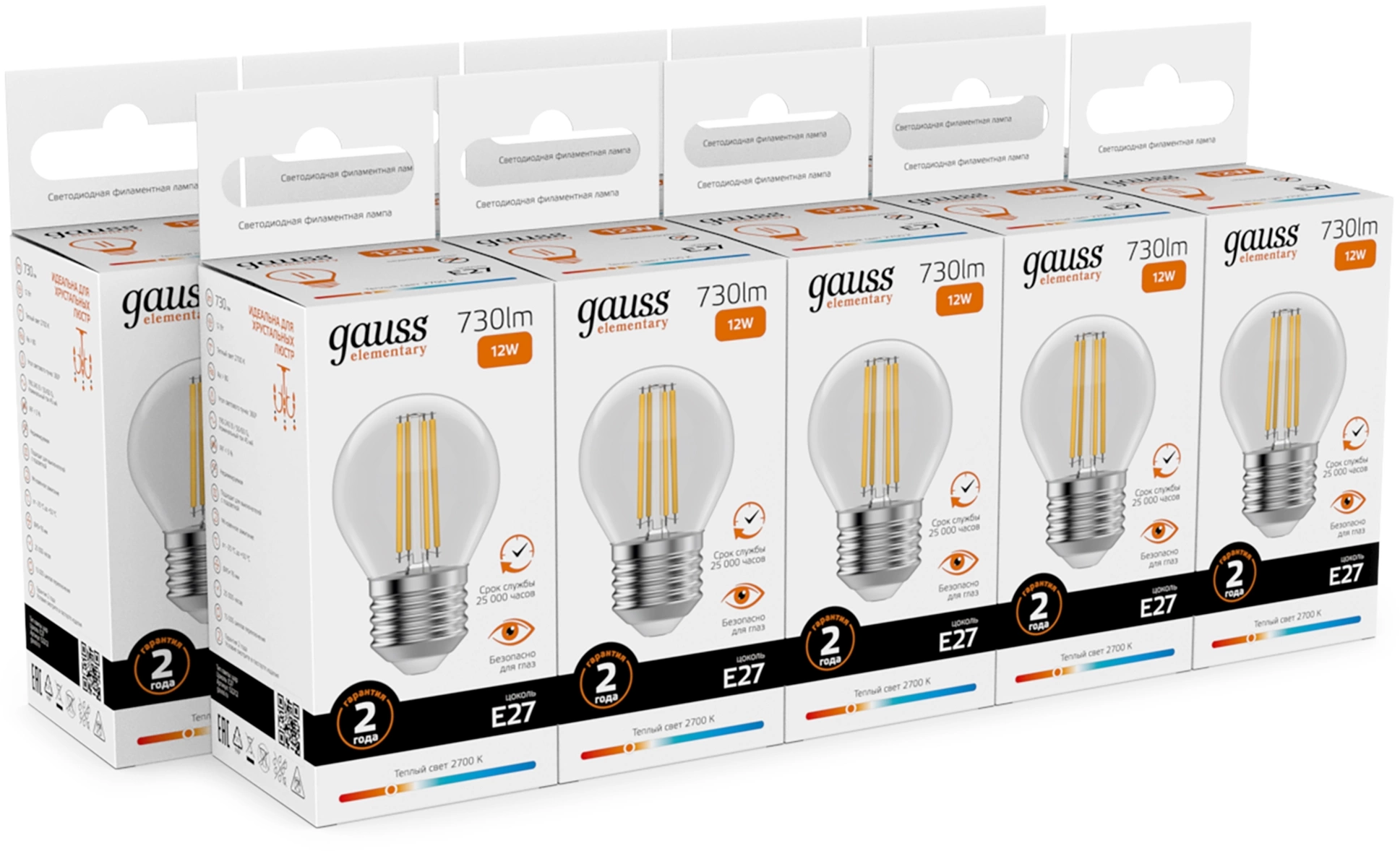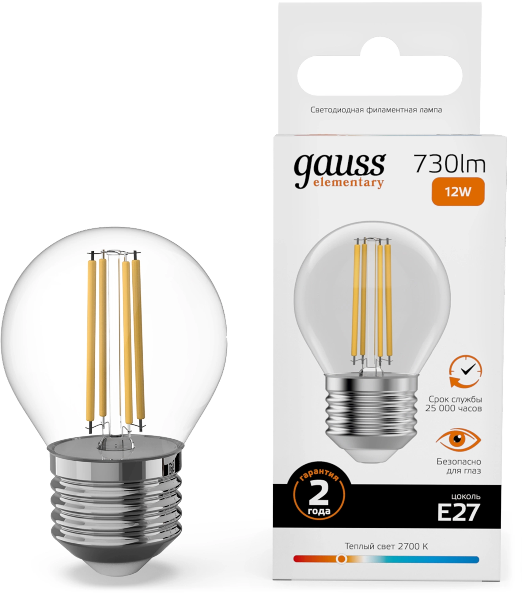 Лампа филам. Gauss Filament 12Вт цок.:E27 шар 220B св.свеч.бел.теп. (упак.:10шт) (52212)
