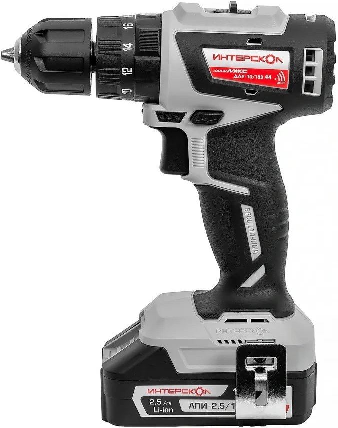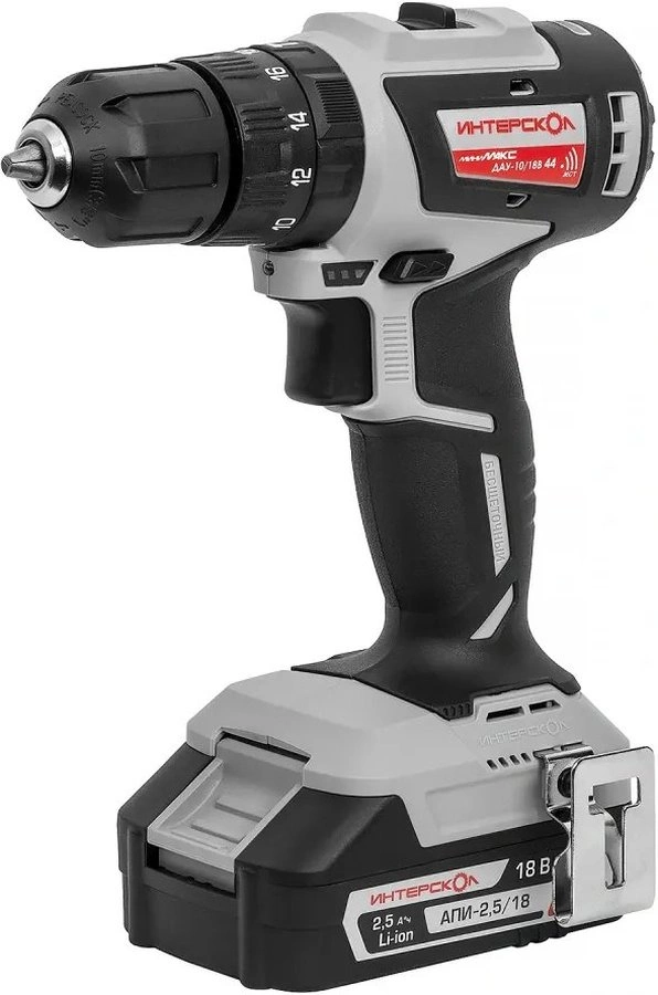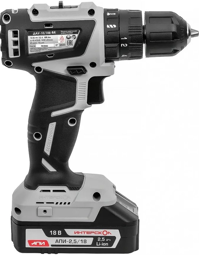 Дрель-шуруповерт, АКБ АПИ-2,5/18 емкостью 2,5 А•ч (50 Вт•ч) - 2 шт., часовое моноблочное зарядное устройство, пластиковый кейс, инструкция по эксплуатации и безопасности, гарантийный талон, список сервисных центров.