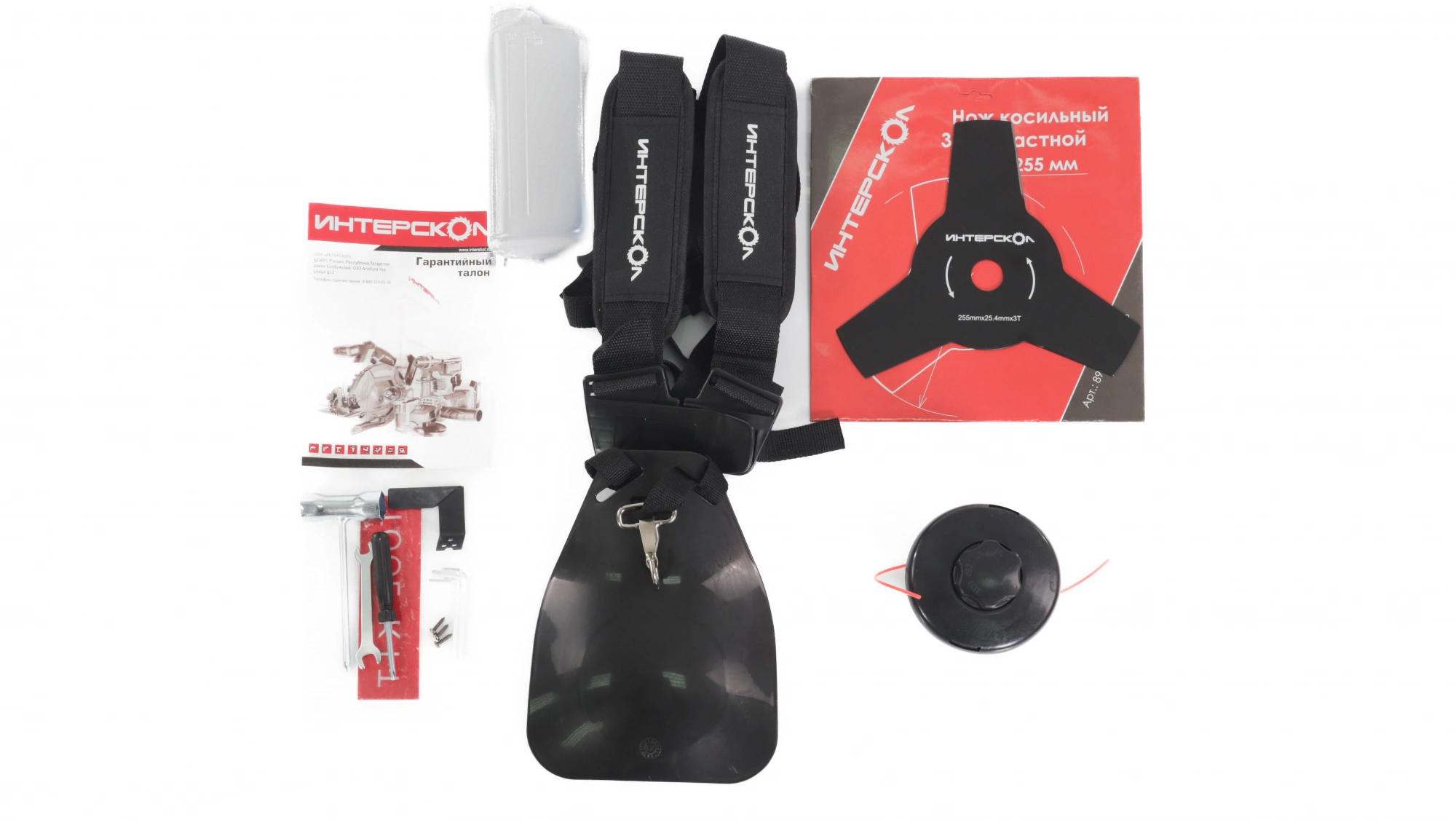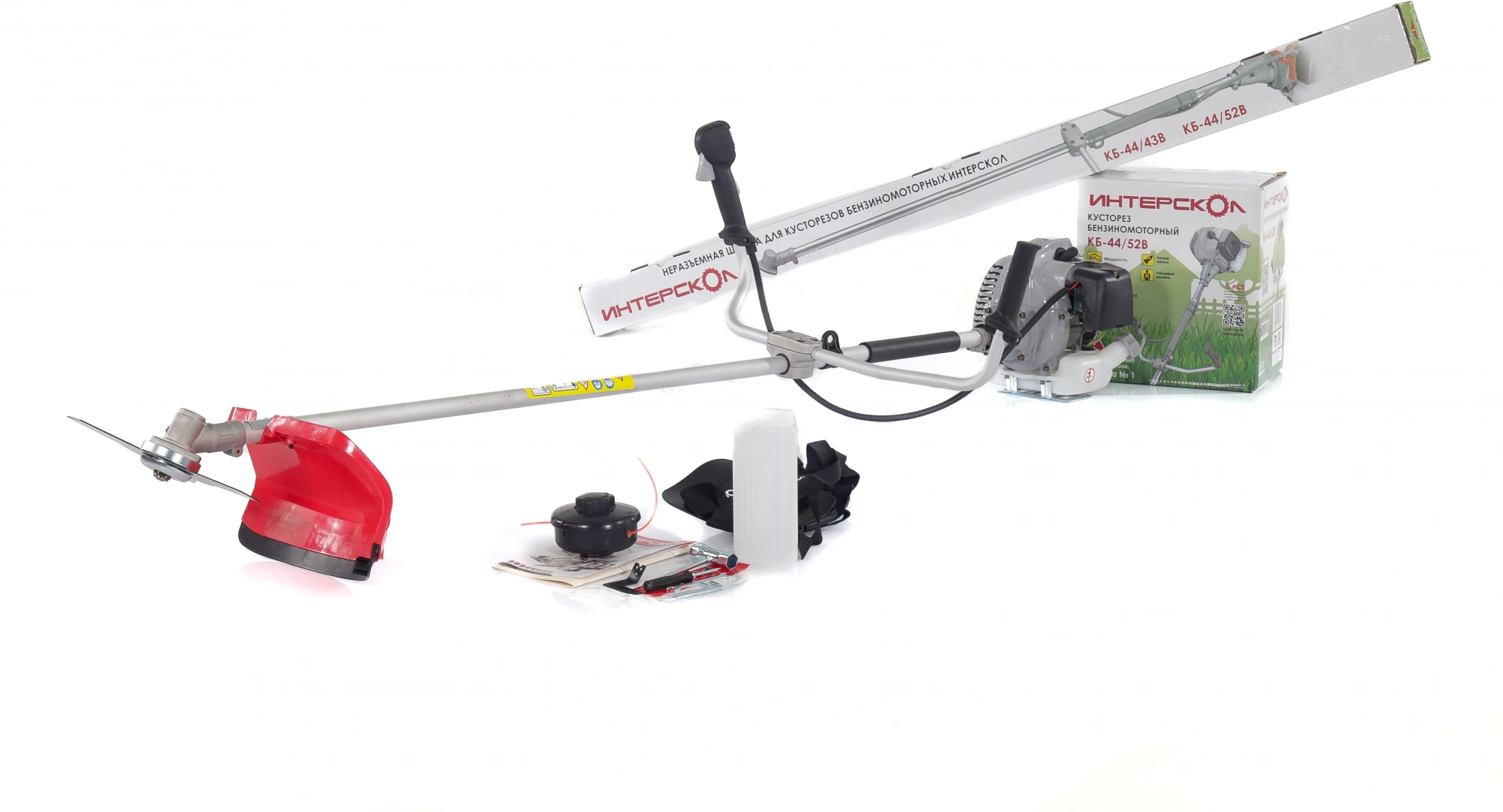 Кусторез,Инструкция по безопасности,Руководство по эксплуатации, Гарантийный талон,Рукоятка двухсоставная велосипедного типа,Нож трёхлопастный,Комплект крепежа,Кожух защитный,Головка режущая с леской, Двухплечевой ремень ранцевого типа, Набор инструмента для обслуживания